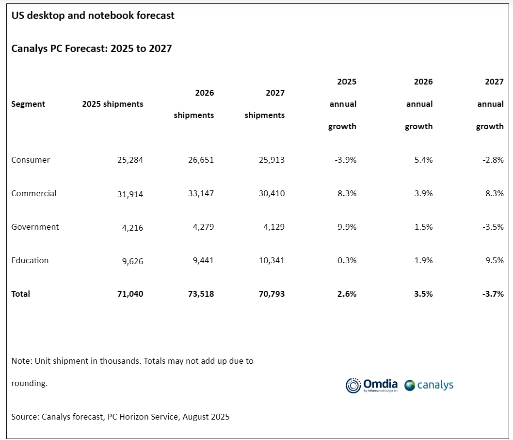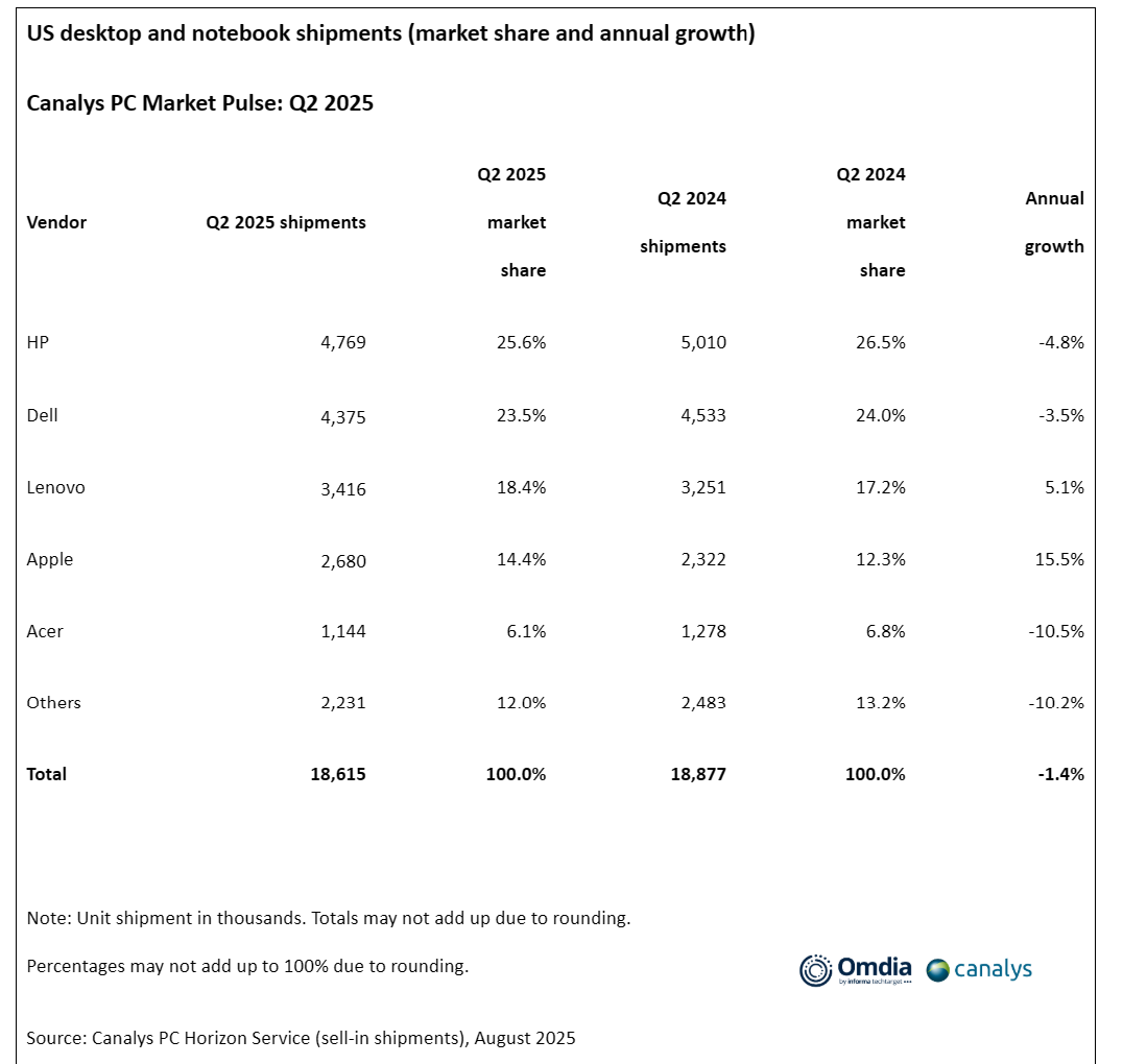 Canalys(隶属于Omdia)的最新研究显示,2025年第二季度,美国的PC出货量(不包括平板电脑)停滞不前,同比下降1.4%,至1860万台。这一疲软表现的背景是,供应商正在努力克服今年早些时候发货量增加造成的高库存水平,以限制预期关税带来的风险。尽管如此,预计2025年和2026年将有3%的温和增长,主要是受Windows 11持续过渡的推动。