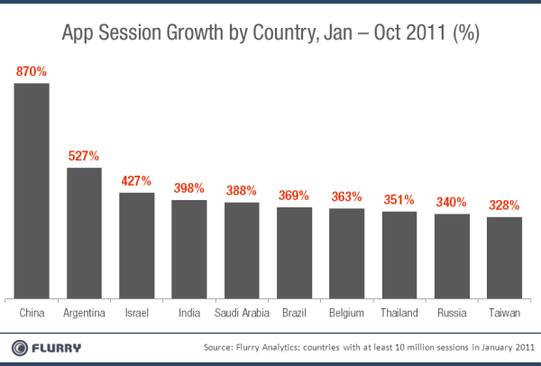 据TechCrunch网站报道,中国拥有世界上最多的手机用户,而根据移动应用分析公司Flurry的调查,中国手机用户对移动应用的使用达到前所末有的程度。今年1月至10月,Flurry调查了12万个移动应用的“对话(session,指使用情况)”,发现有10个国家移动应用的使用增长最快。