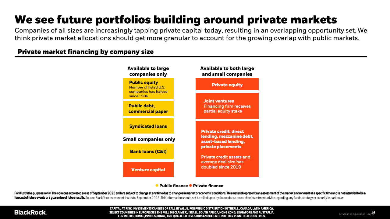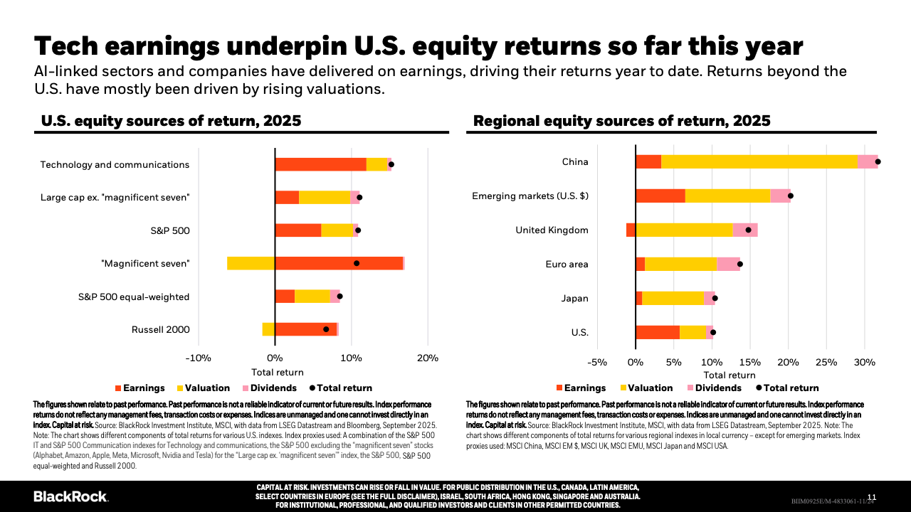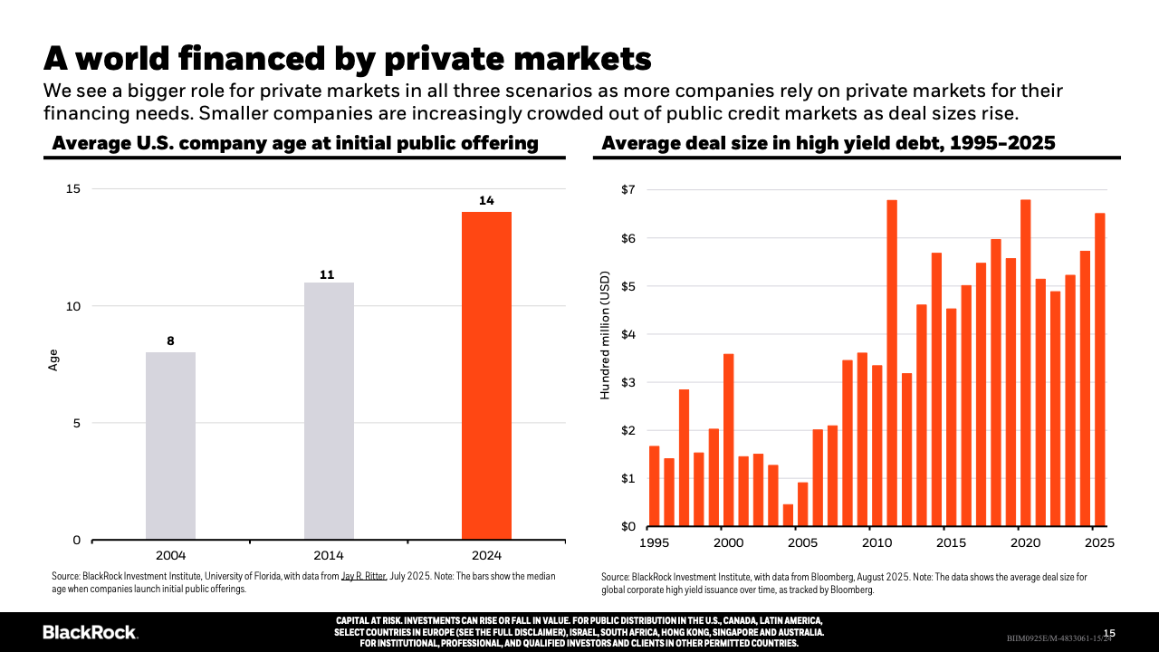 企业投资方面,AI相关领域的软硬件投入迅速增加,有力推动美国经济活动,部分抵消了消费者支出放缓的影响。私募市场融资日益活跃,企业尤其是中小企业更依赖私募资金,公共市场融资规模及上市公司数量均呈下降趋势,显示资本市场结构在发生深刻变革。地缘政治和贸易政策不确定性依旧存在,导致投资者偏好更为谨慎,增大了市场的波动性和分化。