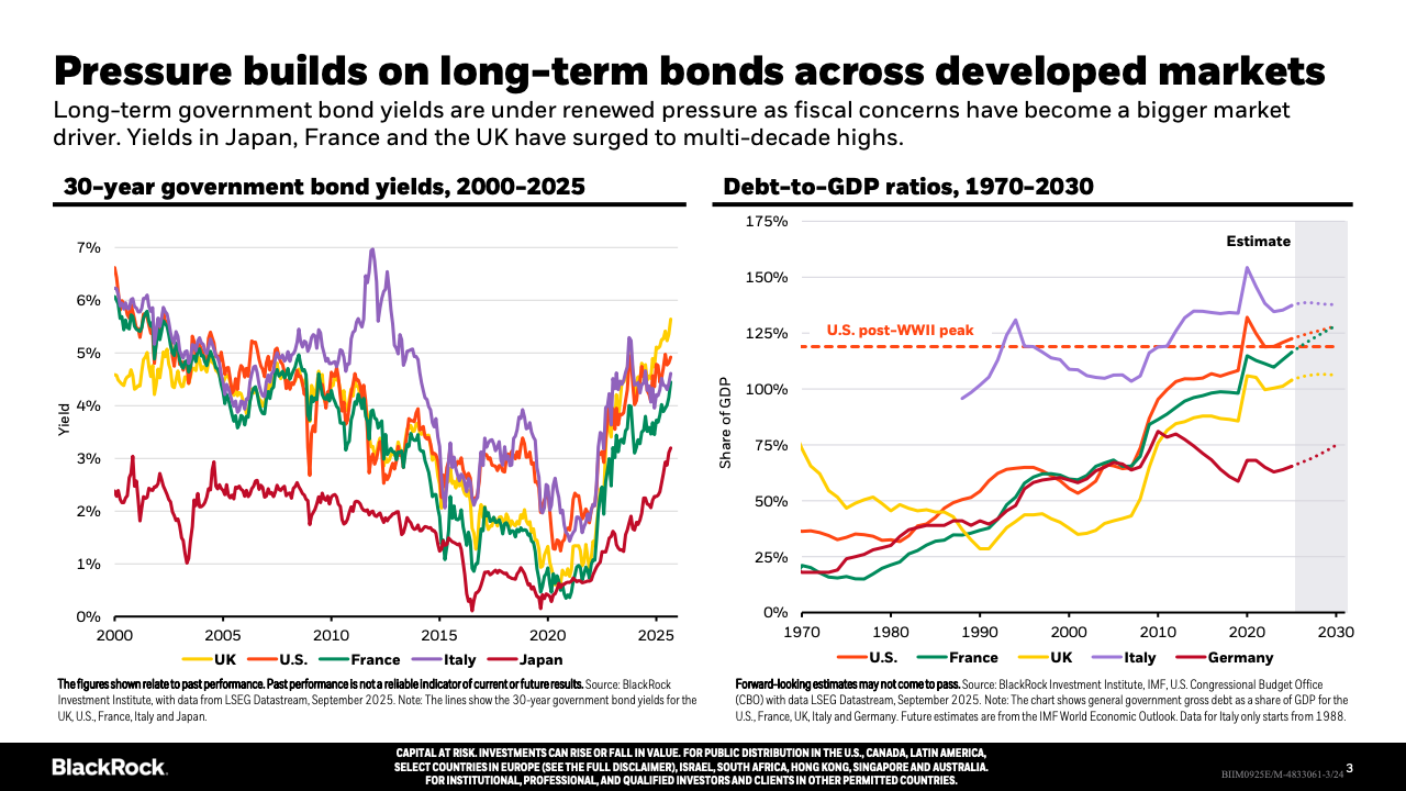 2025年全球经济经历诸多波动,但整体展现出韧性与结构性转变。年初因关税冲击引发的股市大幅波动迅速反弹,验证了经济基本规律对极端政策的制约作用。从区域股市表现看,美国和新兴市场较为活跃,欧洲和日本市场波动较小。股市回升主要由科技及人工智能(AI)相关板块带动,尤其是美国市场显示了强劲的企业盈利能力支撑其估值。与此同时,长期政府债券收益率承压,多国债务与GDP比率持续攀升,加剧了财政负担,尤其是日本、法国和英国等发达经济体。