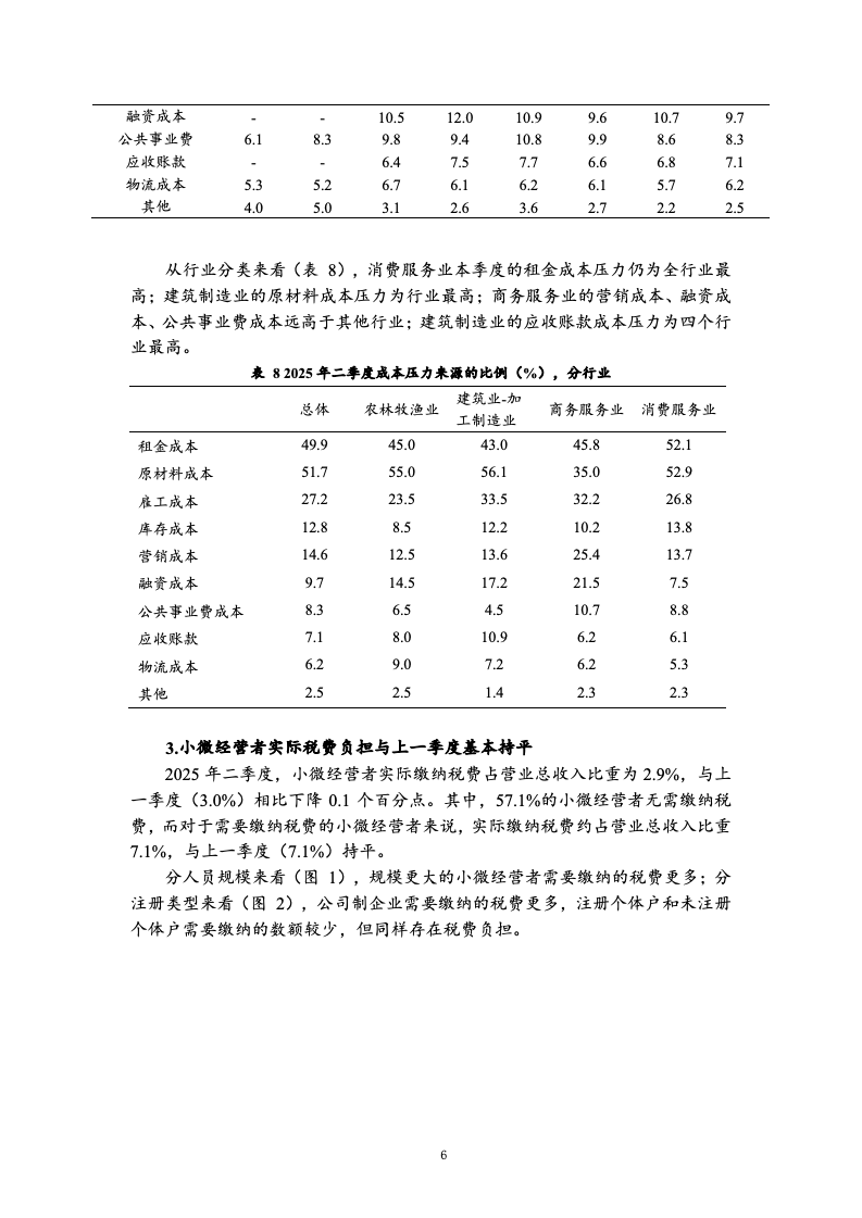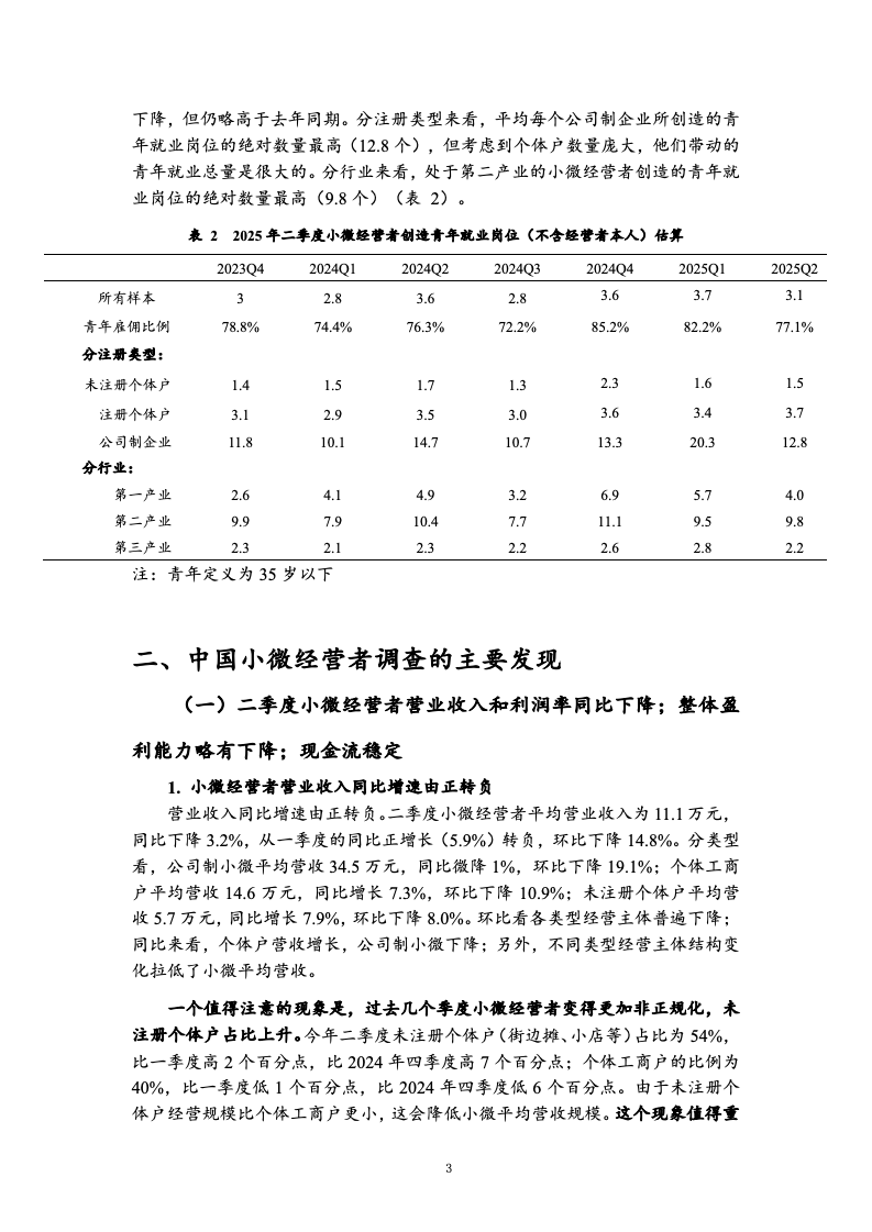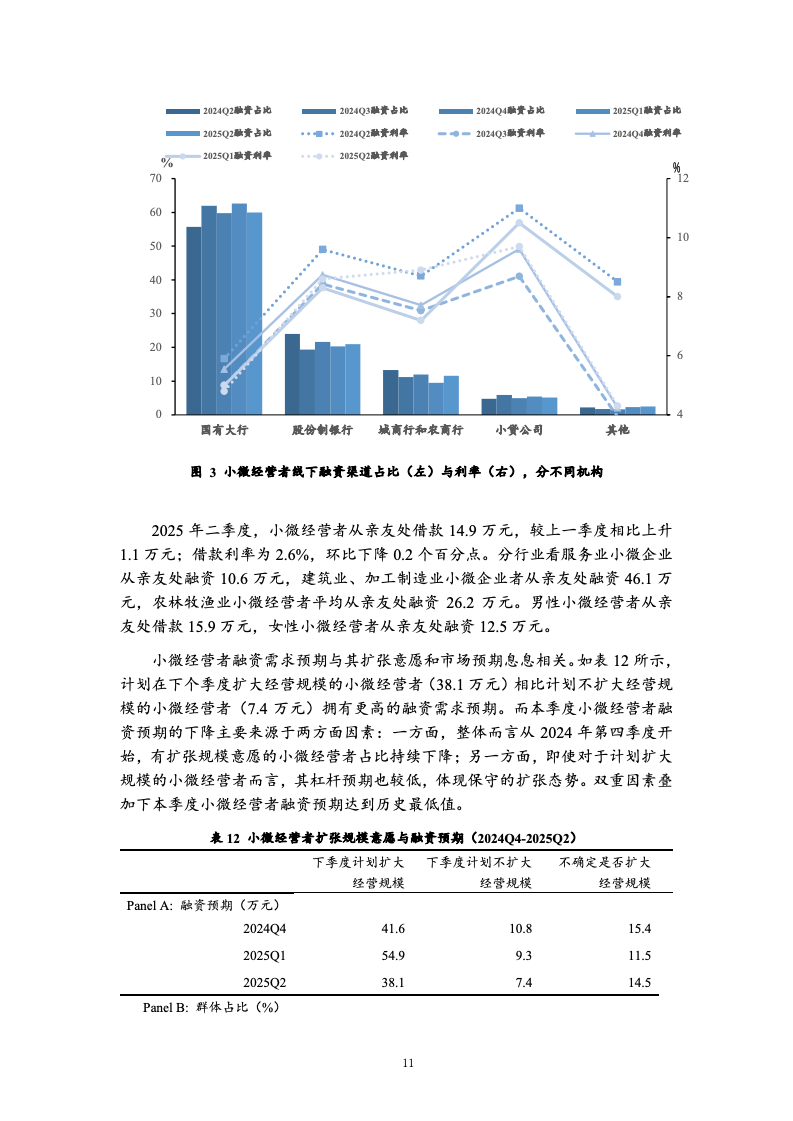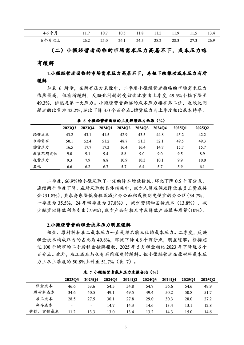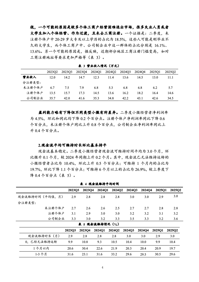 1、营业收入同比增速由正转负,利润率下滑,现金流维持时长企稳。二季度小微经营者平均营业收入为11.1 万元,同比增速从一季度的 5.9%降至-3.2%,环比下降 14.8%,营收变化部分由于样本结构变化影响,部分反映出小微面临需求不足。净利润率均值 4.5%,同比不变,环比下降0.2个百分点。现金流维持时间平均为3.0个月,环比微升 0.1 个月,较2024年同期增加0.2个月。