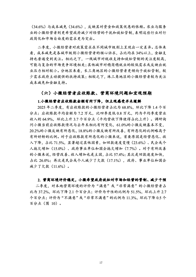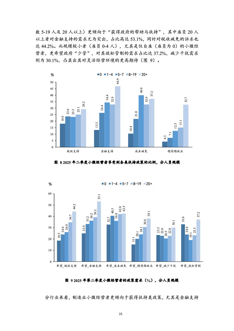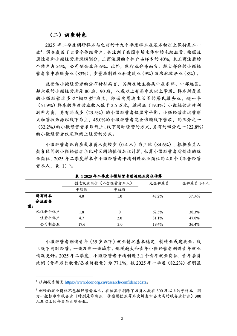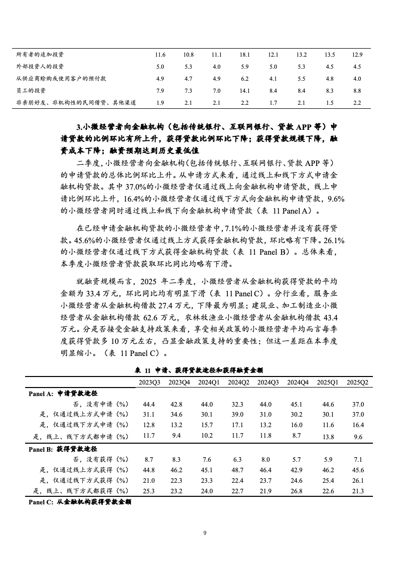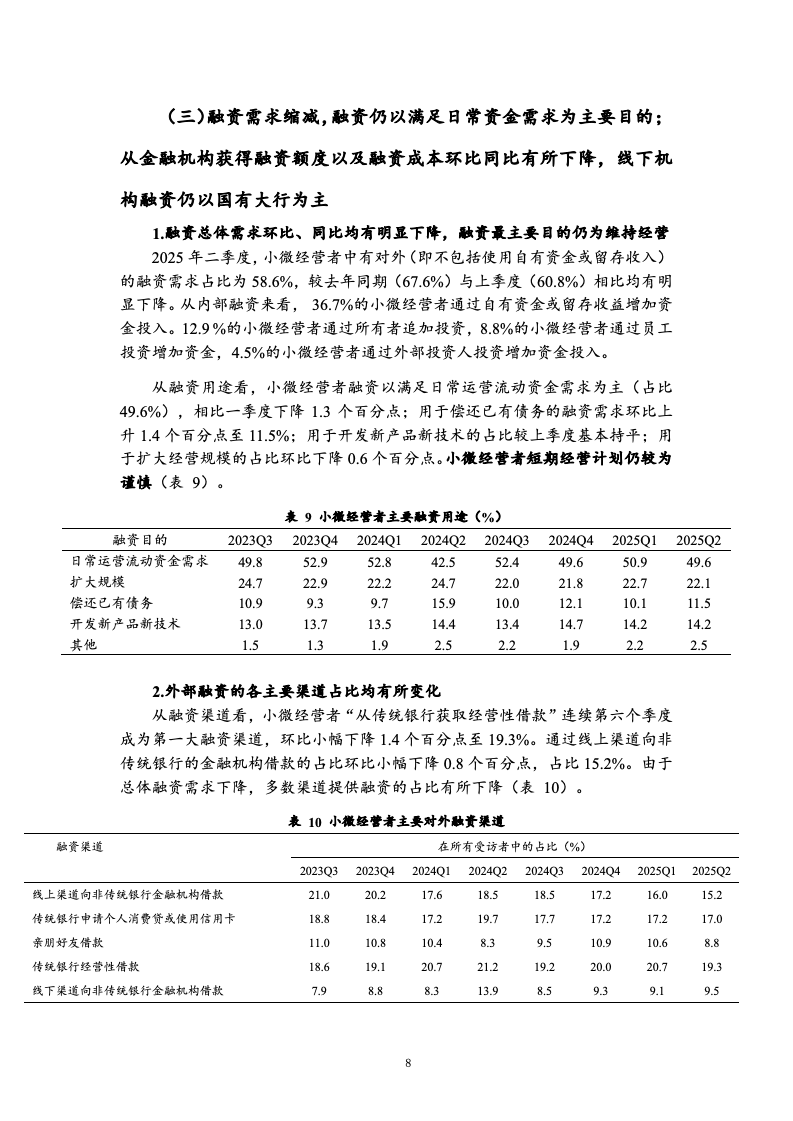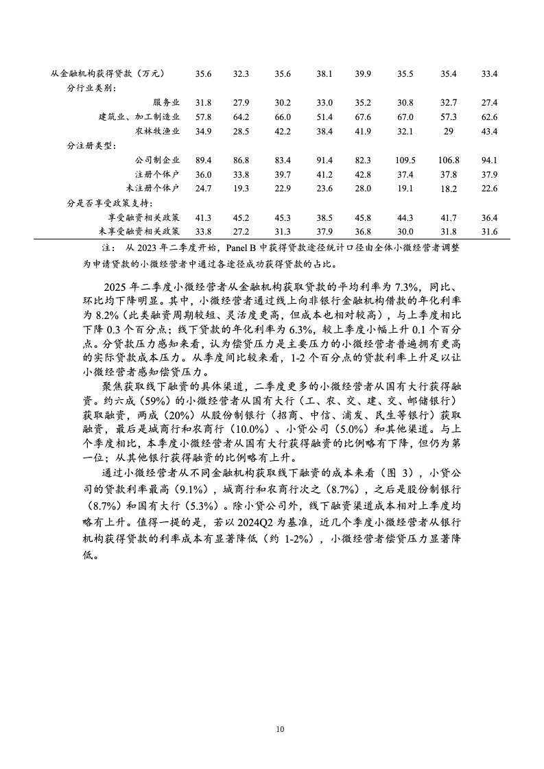 1、营业收入同比增速由正转负,利润率下滑,现金流维持时长企稳。二季度小微经营者平均营业收入为11.1 万元,同比增速从一季度的 5.9%降至-3.2%,环比下降 14.8%,营收变化部分由于样本结构变化影响,部分反映出小微面临需求不足。净利润率均值 4.5%,同比不变,环比下降0.2个百分点。现金流维持时间平均为3.0个月,环比微升 0.1 个月,较2024年同期增加0.2个月。