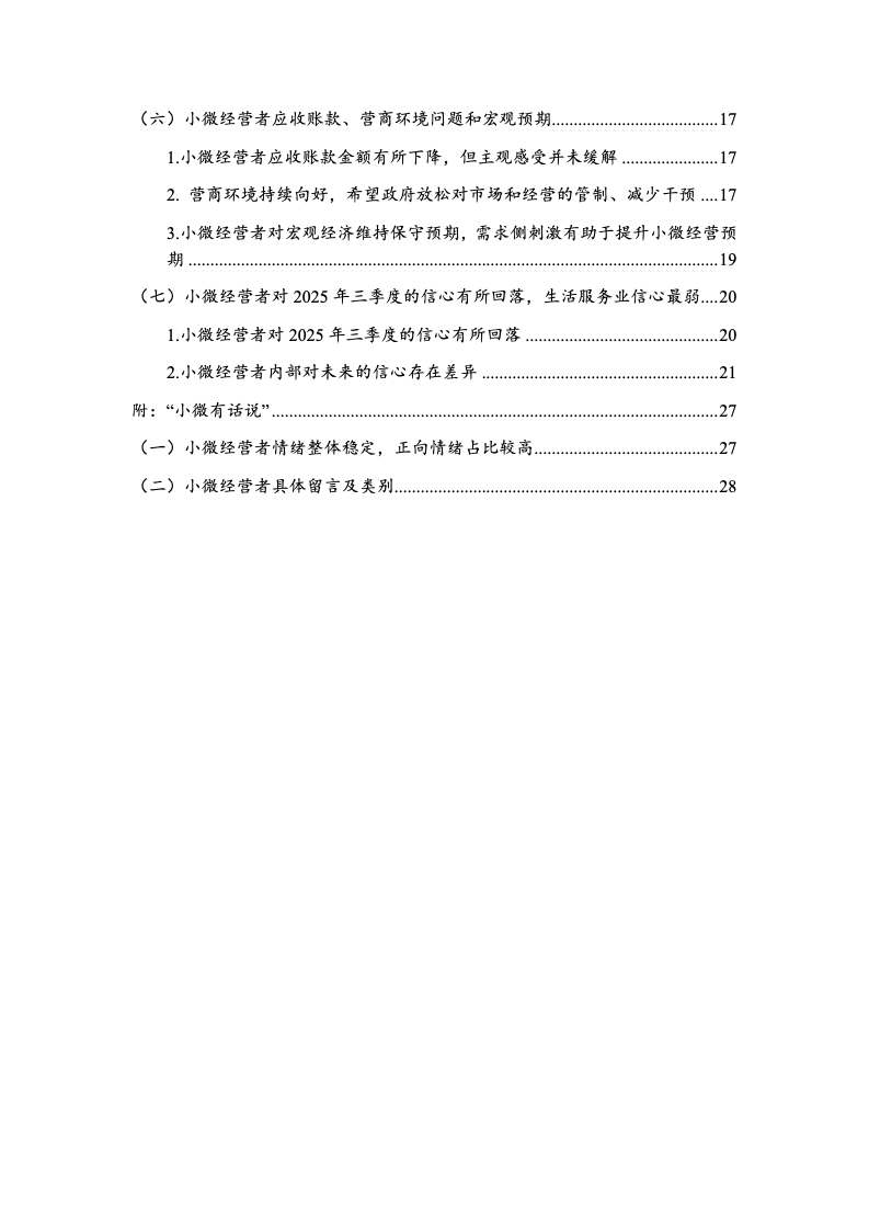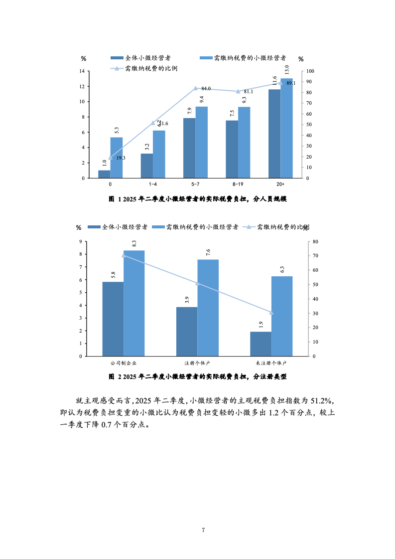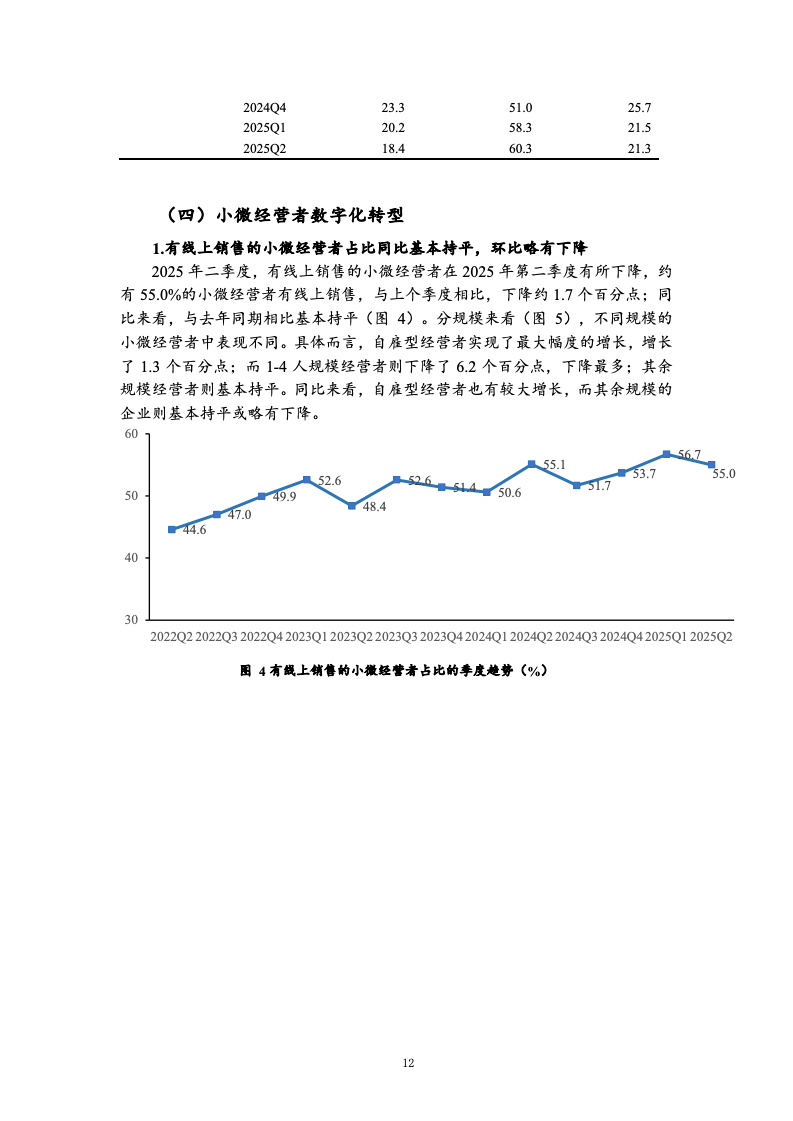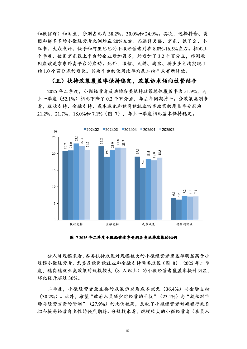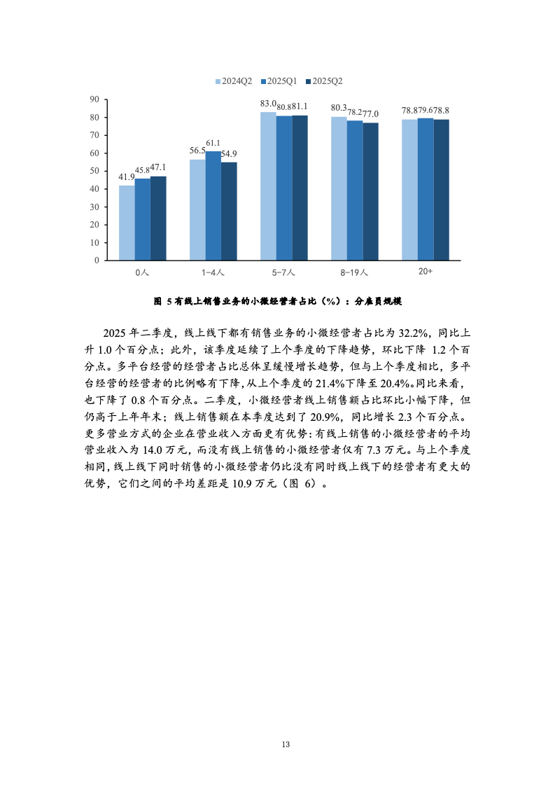 1、营业收入同比增速由正转负,利润率下滑,现金流维持时长企稳。二季度小微经营者平均营业收入为11.1 万元,同比增速从一季度的 5.9%降至-3.2%,环比下降 14.8%,营收变化部分由于样本结构变化影响,部分反映出小微面临需求不足。净利润率均值 4.5%,同比不变,环比下降0.2个百分点。现金流维持时间平均为3.0个月,环比微升 0.1 个月,较2024年同期增加0.2个月。