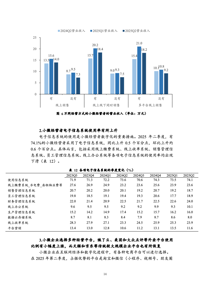 4、数字化转型深化,线上经营占比同比基本持平。55.0%的小微开展线上销售,环比下降1.7 个百分点,同比基本持平。电子信息系统使用率保持在高位74.1%,同比上升0.5 个百分点,环比上升 0.6 个百分点;多平台经营的经营者的比例略有下降,从上个季度的21.4%下降至20.4%,跨境平台的平均营收在所有平台中位居首位。