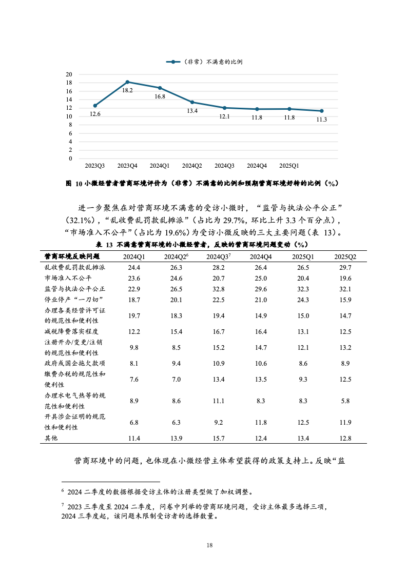 5、政策覆盖率保持穩定,营商环境持续向好,希望政府放松对市场和经营的管制、减少干预。本季度扶持政策覆盖率为51.9%,与上一季度和去年同期(均为 52.1%)基本持平;其中,受益于税收与金融支持的小微占比最高,分别达到 21.2%和21.7%。对地方营商环境评价不满意的比例为 11.3%,同比、环比均有下降。不满意的主要问题体现在“监管与执法公平公正”(32.1%),“乱收费乱罚款乱摊派”(29.7%,环比上升3.3个百分点),“市场准入不公平”(19.6%)。