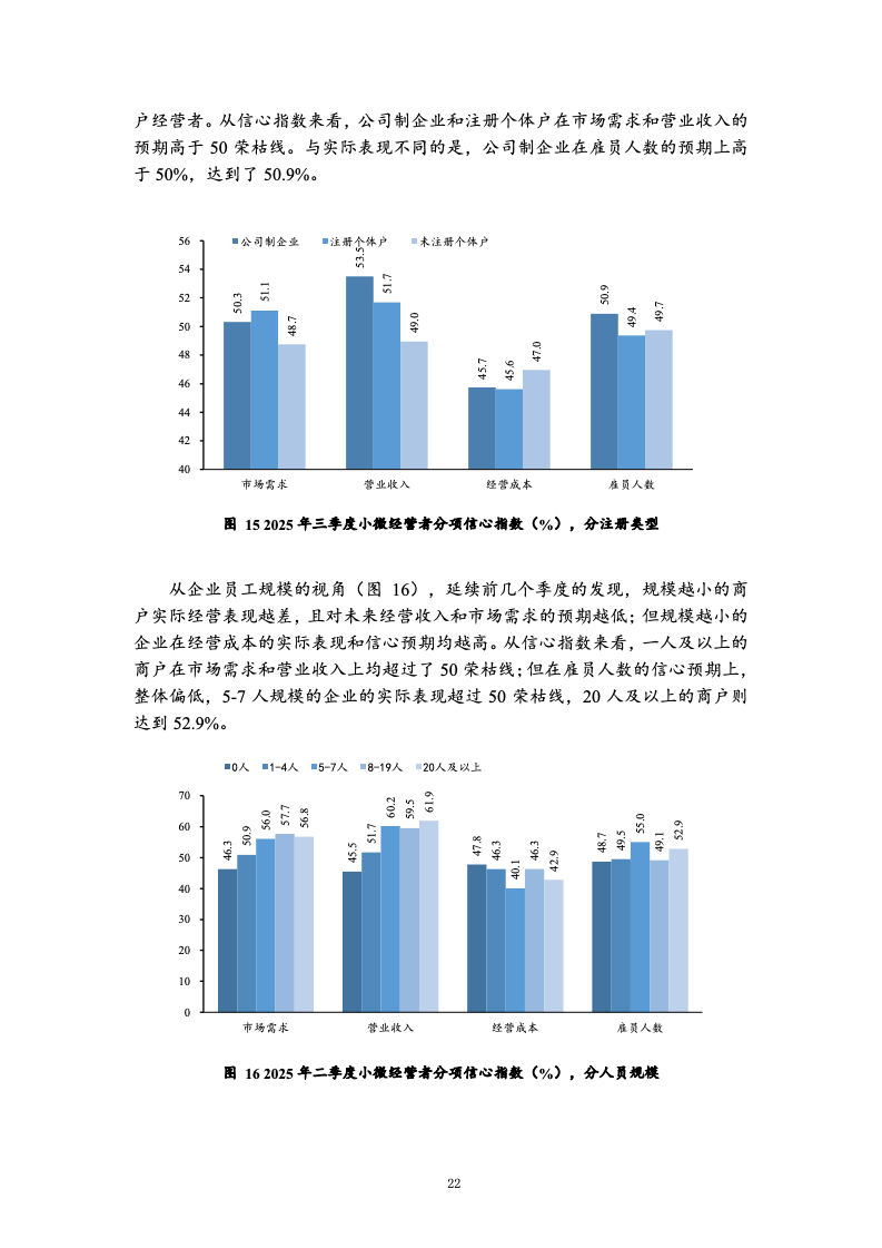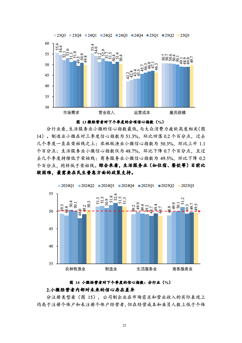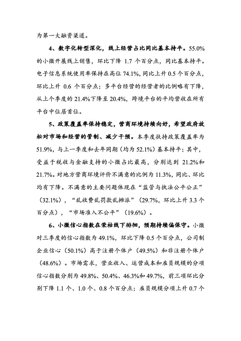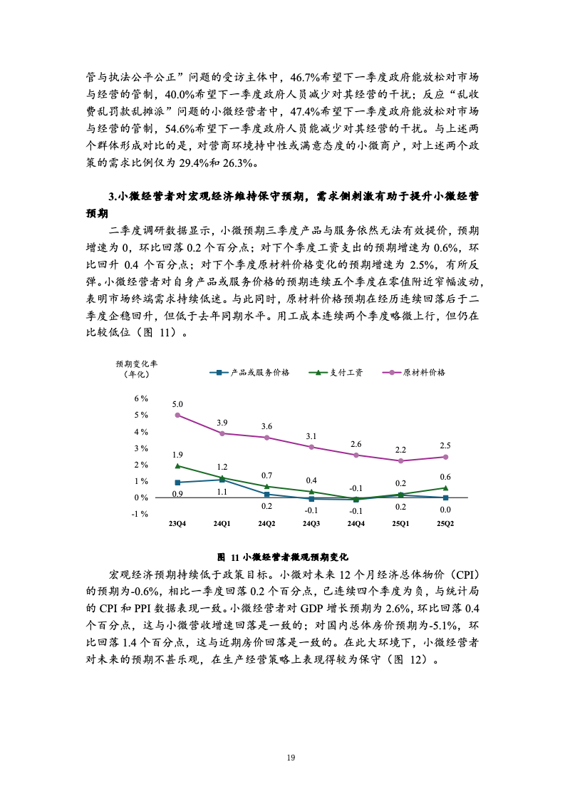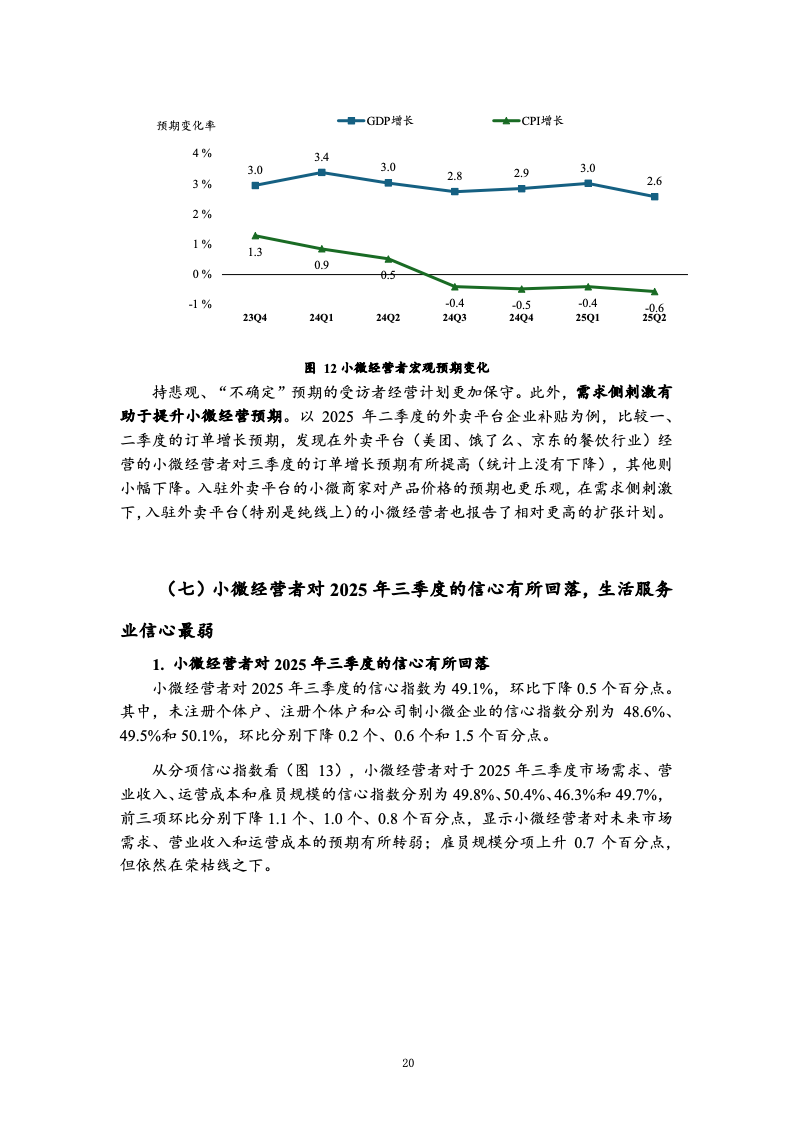 6、小微信心指数在荣枯线下徘徊,预期持续偏保守。小微对三季度的信心指数为 49.1%,环比下降 0.5个百分点,公司制企业信心((50.1%)高于注册个体户(49.5%)和非注册个体户(48.6%)。市场需求,营业收入、运营成本和雇员规模的分项信心指数分别为 49.8%、50.4%、46.3%和49.7%,前三项环比分别下降1.1个、1.0个、0.8 个百分点;雇员规模分项上升0.7个百分点,显示小微经营者对未来市场需求、营业收入和运营成本的预期有所转弱。小微经营者对宏观预期低于政策目标,CPI 预期连续四季度为负,GDP 增速预期2.6%,同比、环比均回落 0.4个百分点,与小微营收增速回落一致。