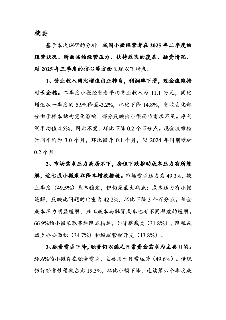 基于本次调研的分析,我国小微经营者在 2025年二季度的经营状况、所面临的经营压力、扶持政策的覆盖、融资情况、对2025年三季度的信心等方面呈现以下特点: