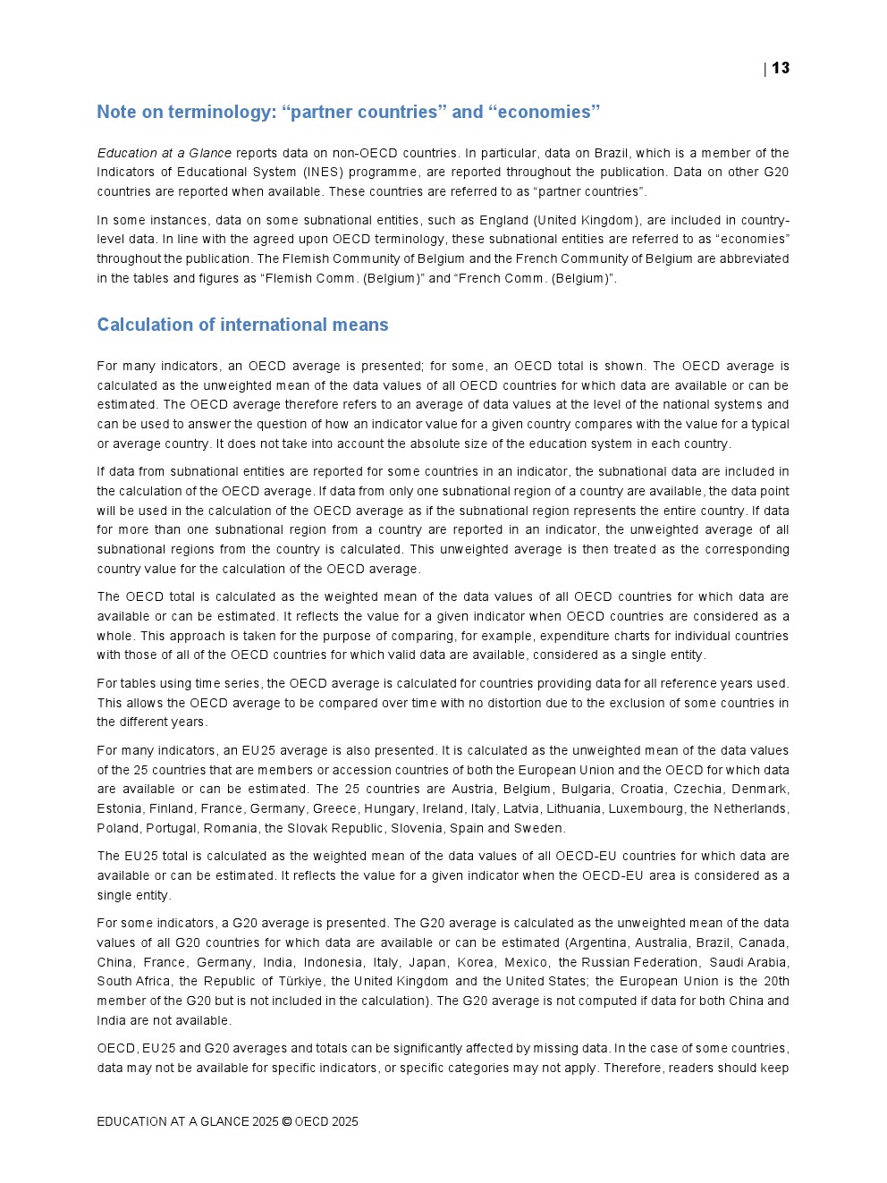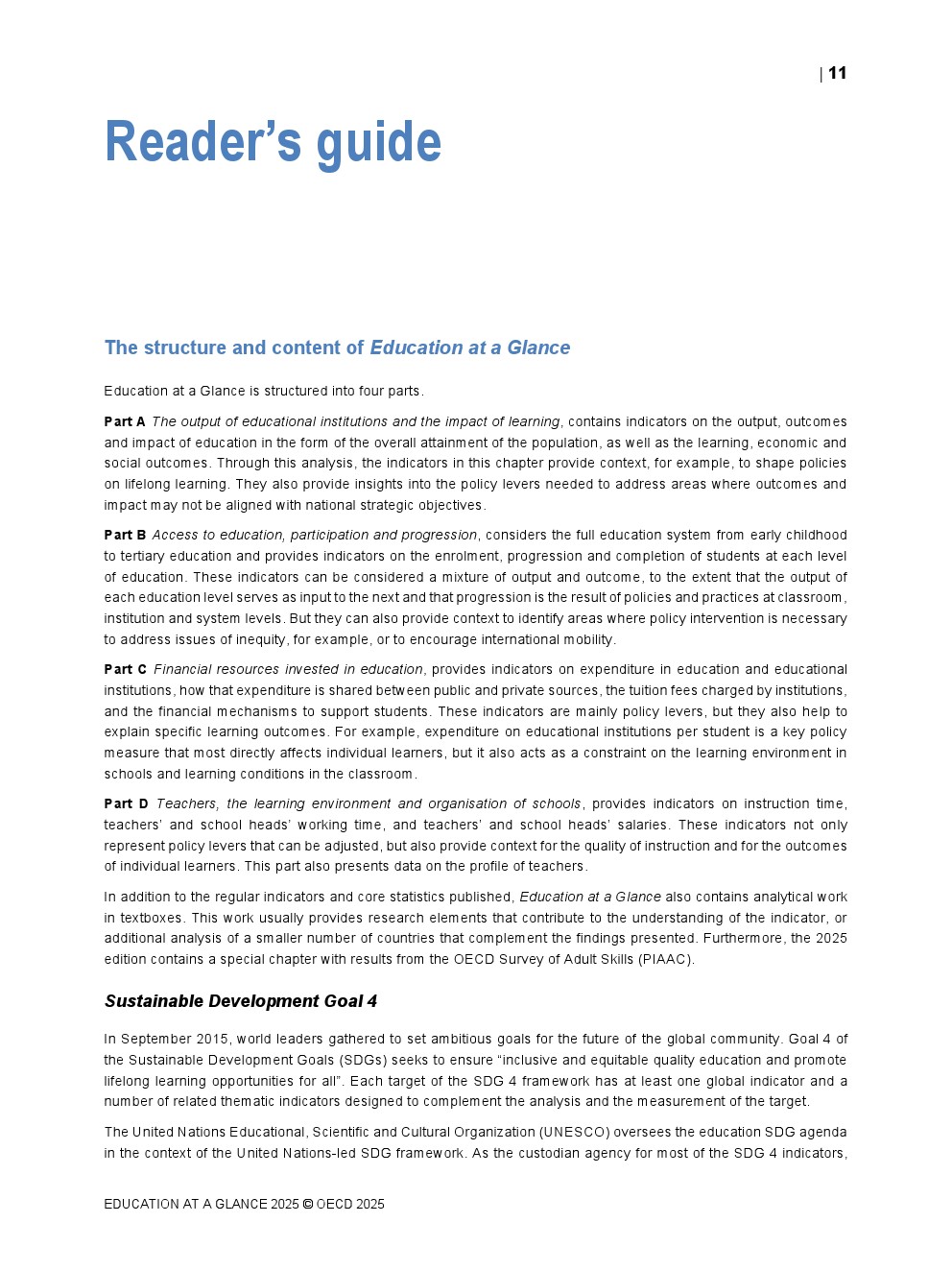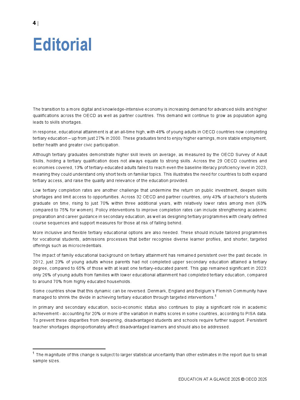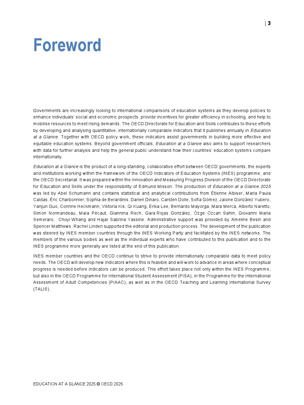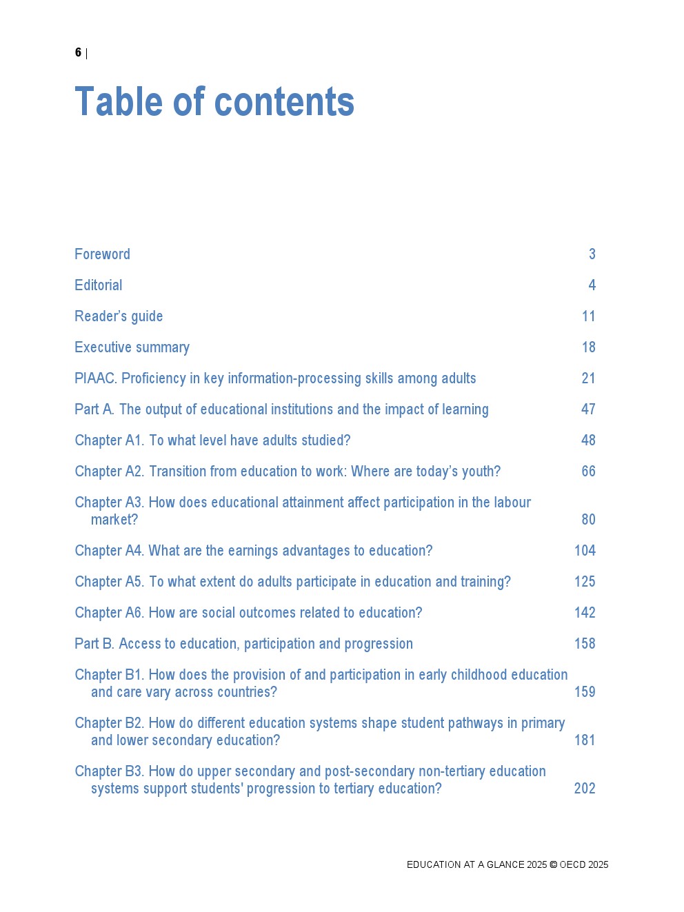 经合组织发布了“2025年教育概览”,提供经合组织(OECD)国家和伙伴经济体教育体系的结构、经费和绩效方面的综合数据。该报告就教育机构的产出、学习在各国的成效、教育机会与参与度、教育财政投入以及学校组织等方面提出了重要见解。