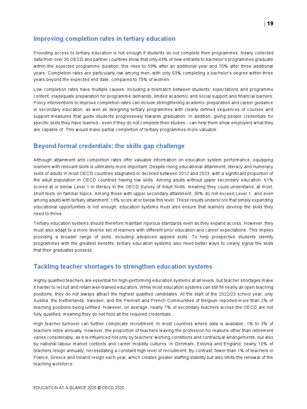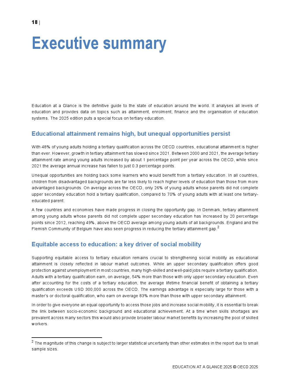 报告特别关注高等教育,考察了高等教育完成率、不同学习行业的劳动力市场结果差异、毕业率以及拥有高等教育学历的成年人的技能。
