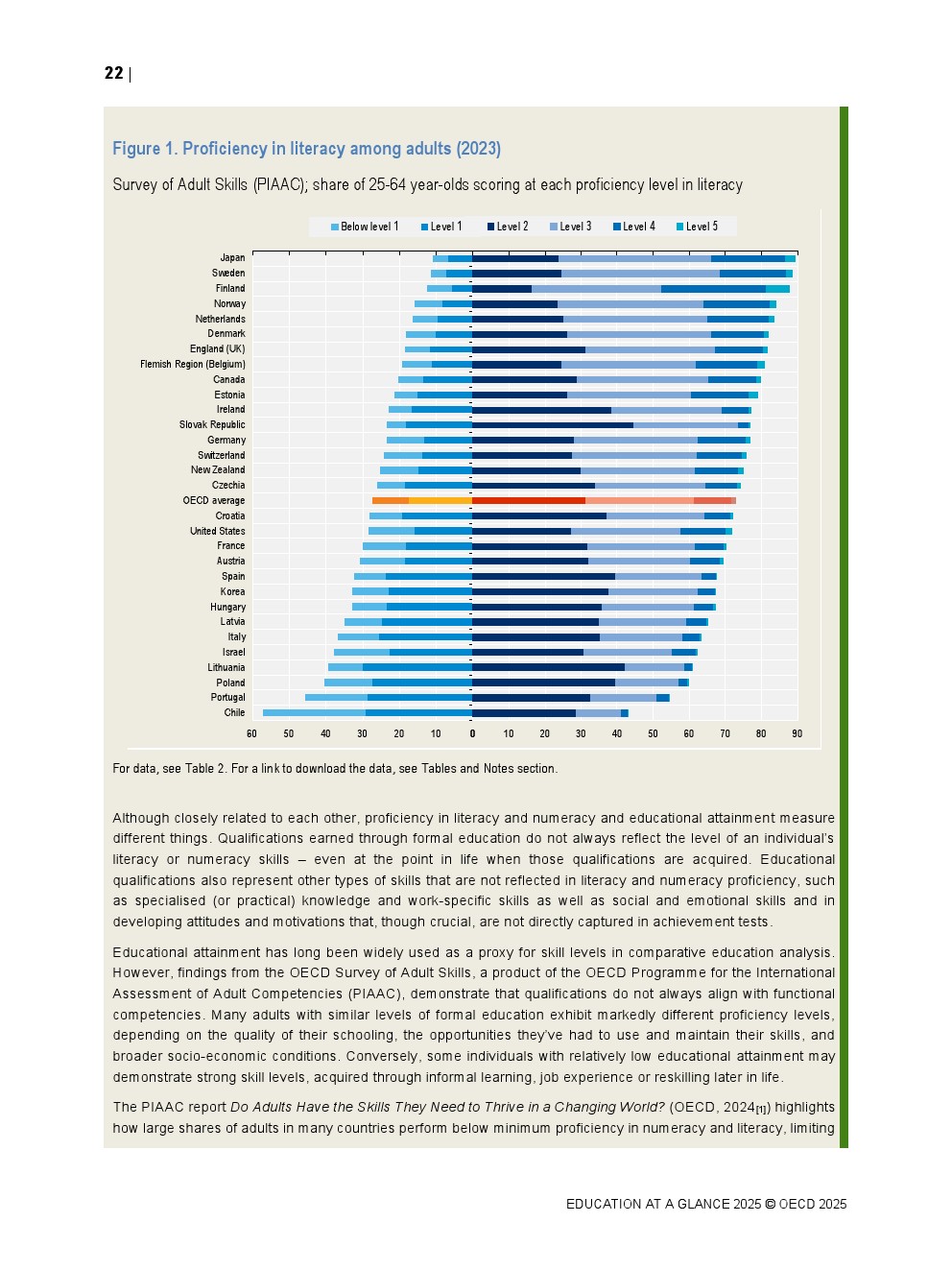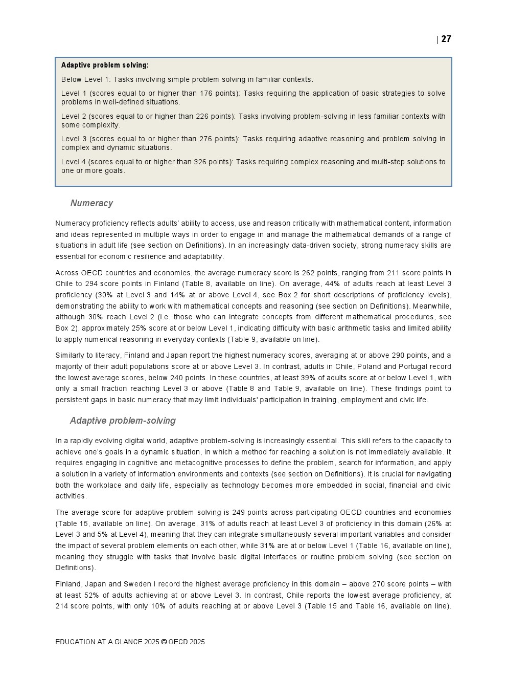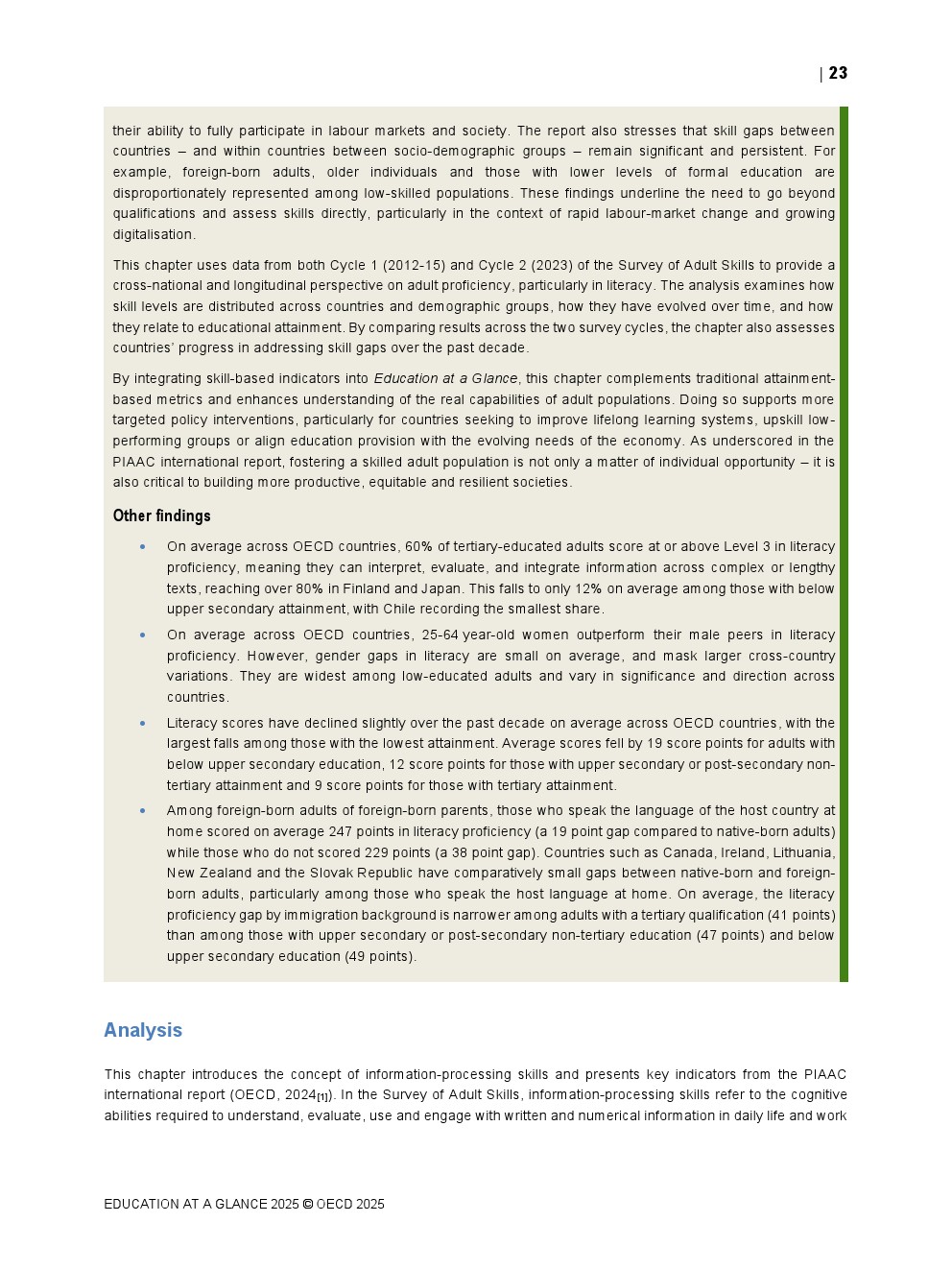 尽管完成率和毕业率提供了关于教育体系绩效的宝贵信息,但让学习者掌握相关技能最终更为重要。尽管教育完成率在上升,但在2012年至2023年间,大多数经合组织国家成年人的读写和计算能力却停滞不前或下降,经合组织国家中有相当大比例的成年人口技能水平低下。这强调,仅仅扩大教育机会是不够的;教育体系还必须确保学习者培养他们茁壮成长所需的技能。