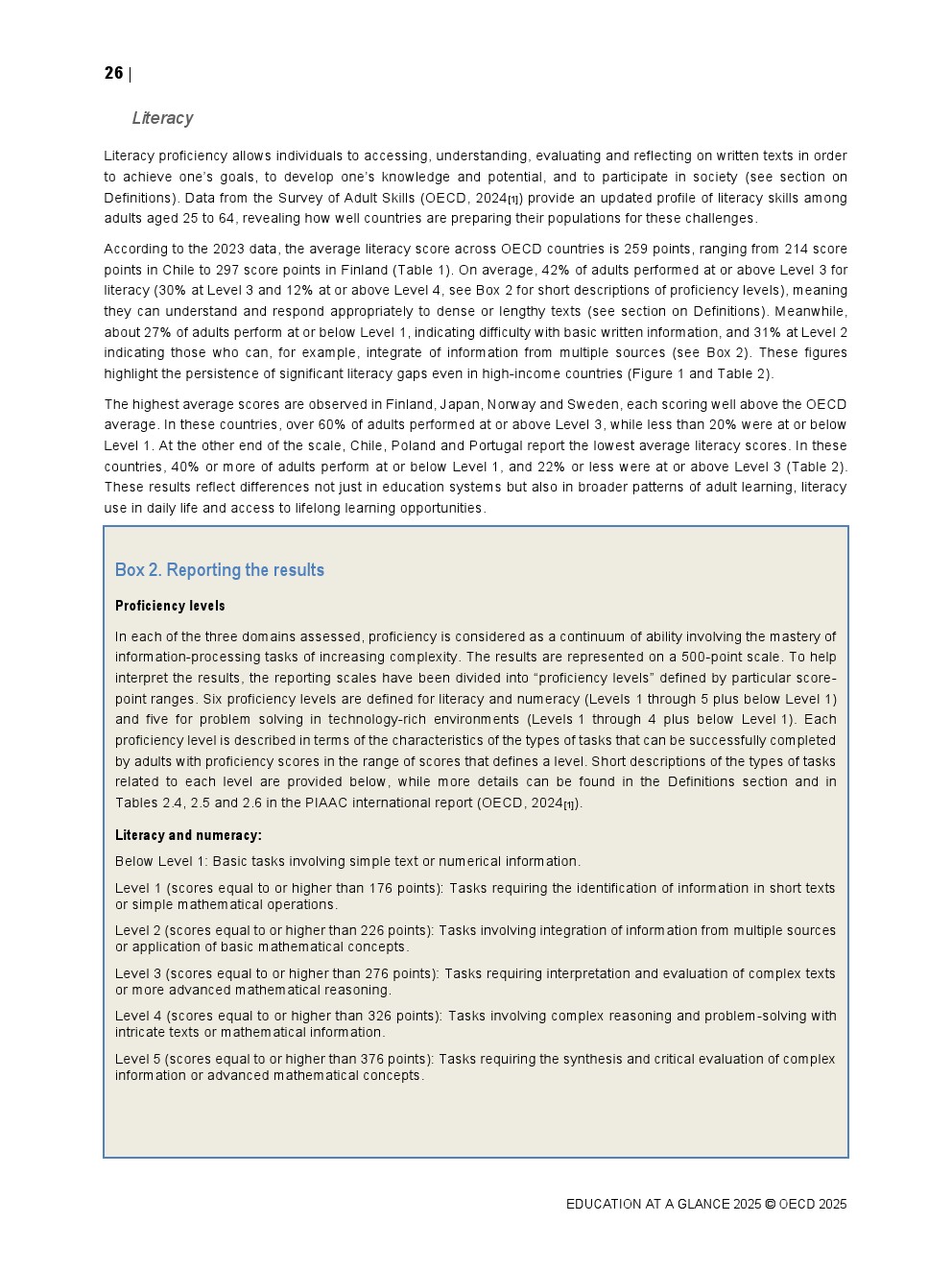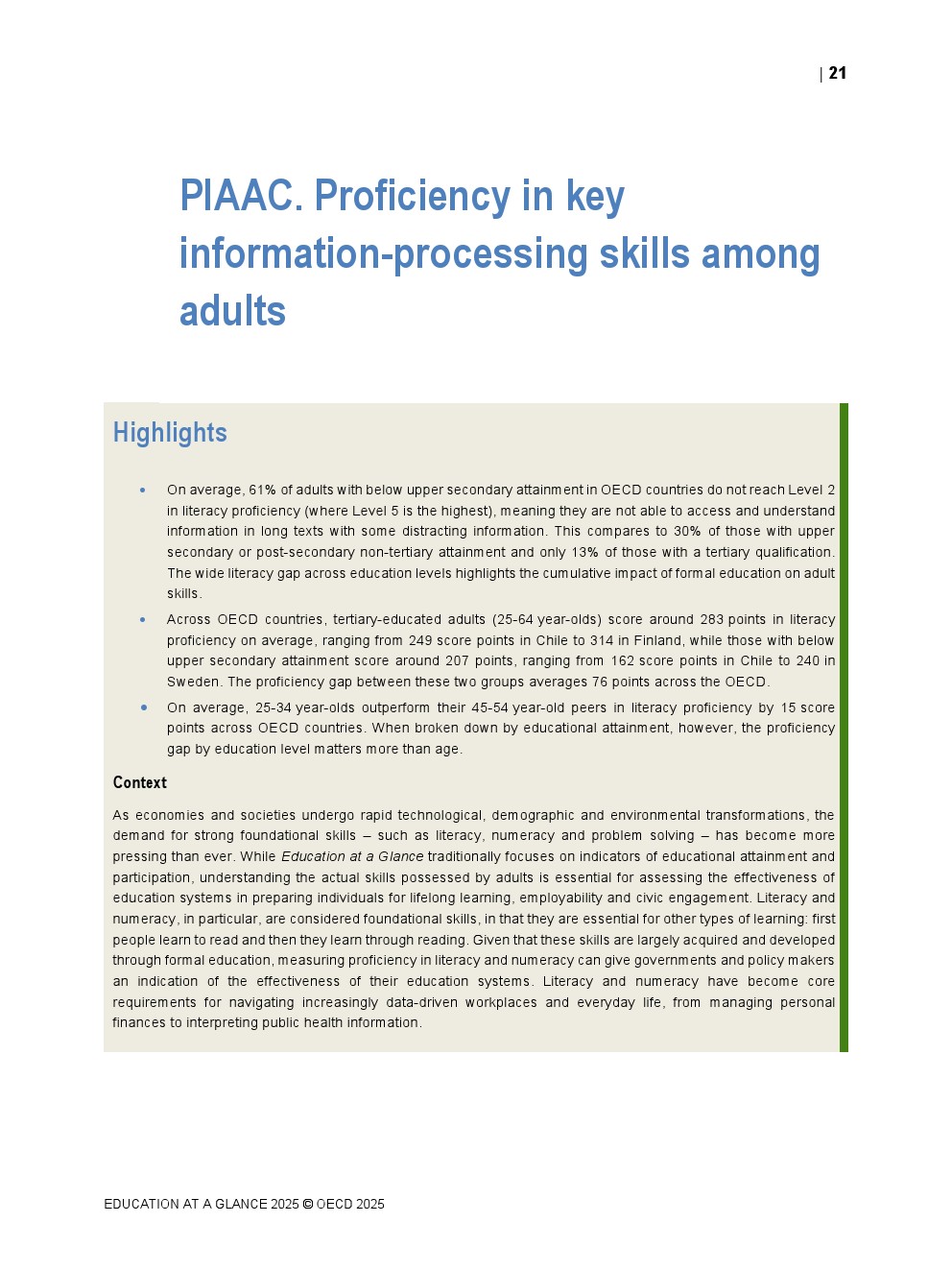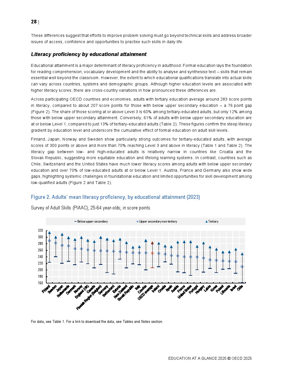 尽管完成率和毕业率提供了关于教育体系绩效的宝贵信息,但让学习者掌握相关技能最终更为重要。尽管教育完成率在上升,但在2012年至2023年间,大多数经合组织国家成年人的读写和计算能力却停滞不前或下降,经合组织国家中有相当大比例的成年人口技能水平低下。这强调,仅仅扩大教育机会是不够的;教育体系还必须确保学习者培养他们茁壮成长所需的技能。