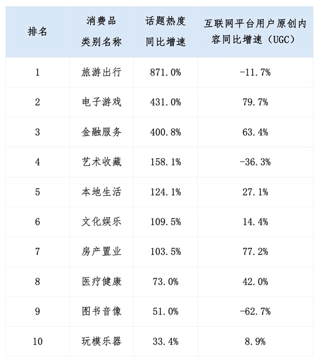 在话题热度方面,第二季度话题热度增速前十的消费品类依次为旅游出行、电子游戏、金融服务、艺术收藏、本地生活、文化娱乐、房产置业、医疗健康、图书音像、玩模乐器。