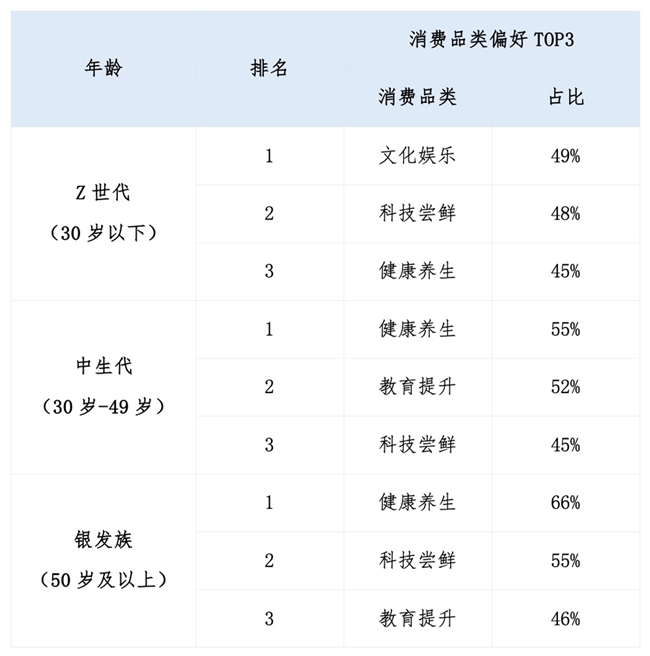其中,Z世代消费群体(30岁以下)以体验型消费为主要特征,核心消费领域依次为文化娱乐、科技尝鲜和健康养生。新兴科技领域,虚拟偶像、AR/VR设备等产品接受度高;健康领域,呈现“朋克养生”趋势,即将个性化生活方式与传统养生理念相结合。中生代消费群体(30-49岁)消费行为体现责任型特征,健康养生、教育提升、科技领域为主要偏好,家庭健康管理、子女教育及实用性科技产品是重点消费品类;银发族消费群体(50岁及以上)呈现品质型消费特征,偏好健康养生、科技尝鲜与教育提升,家用医疗设备、智能手机与线上课程消费增速明显,反映中老年群体数字化生活适应能力不断增强。