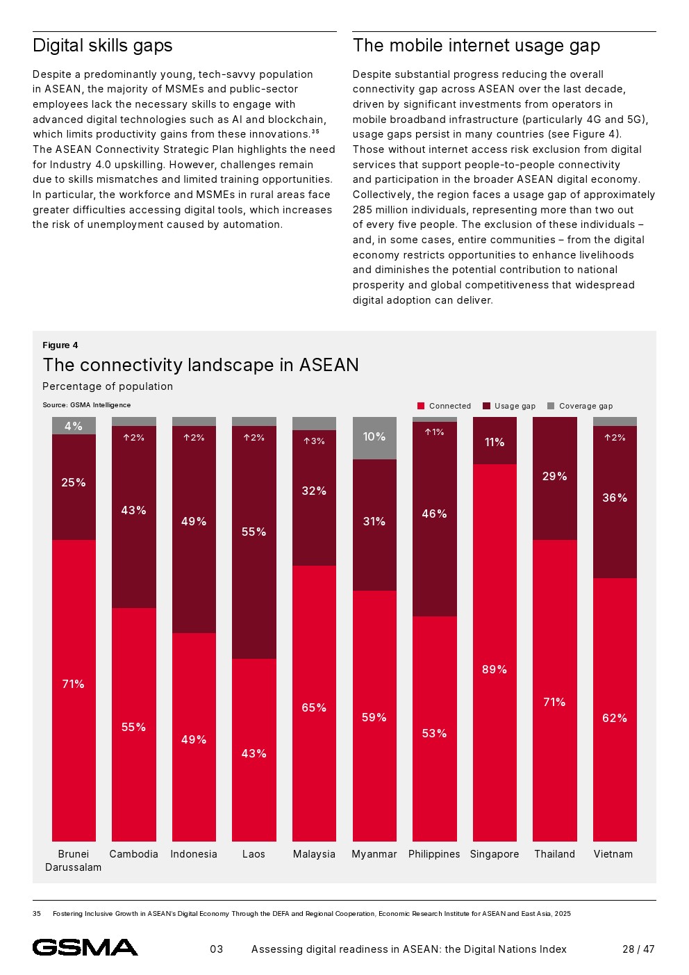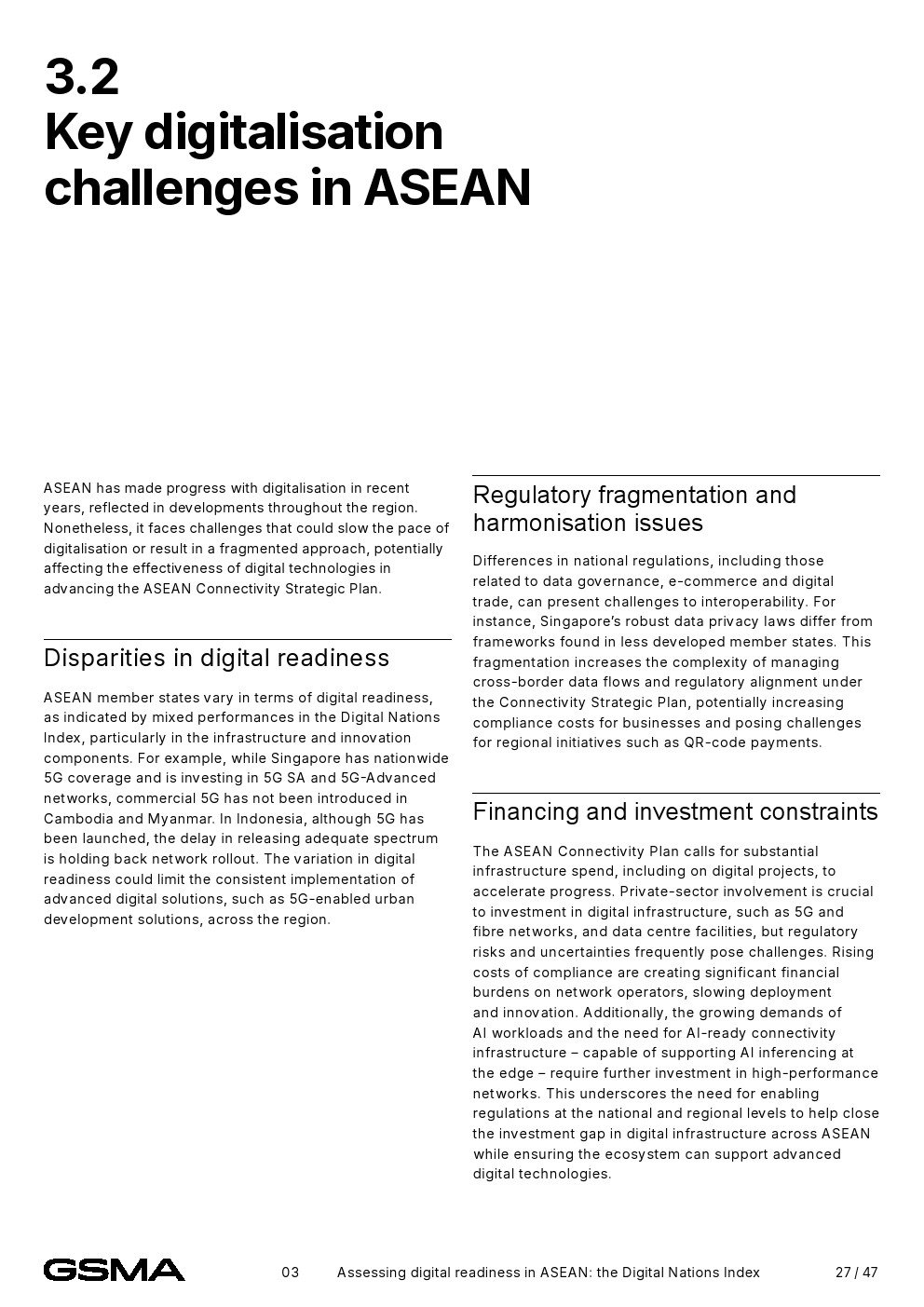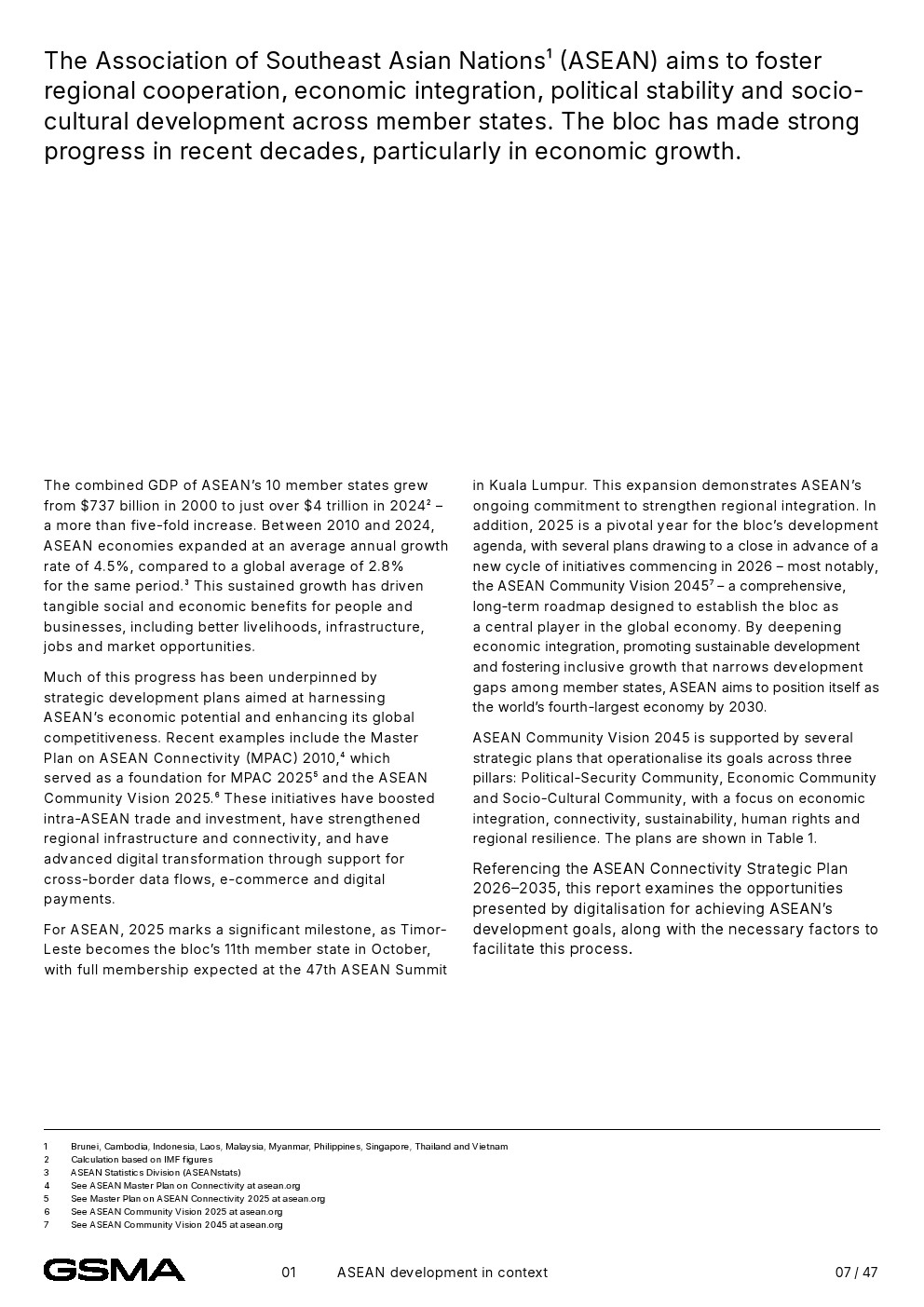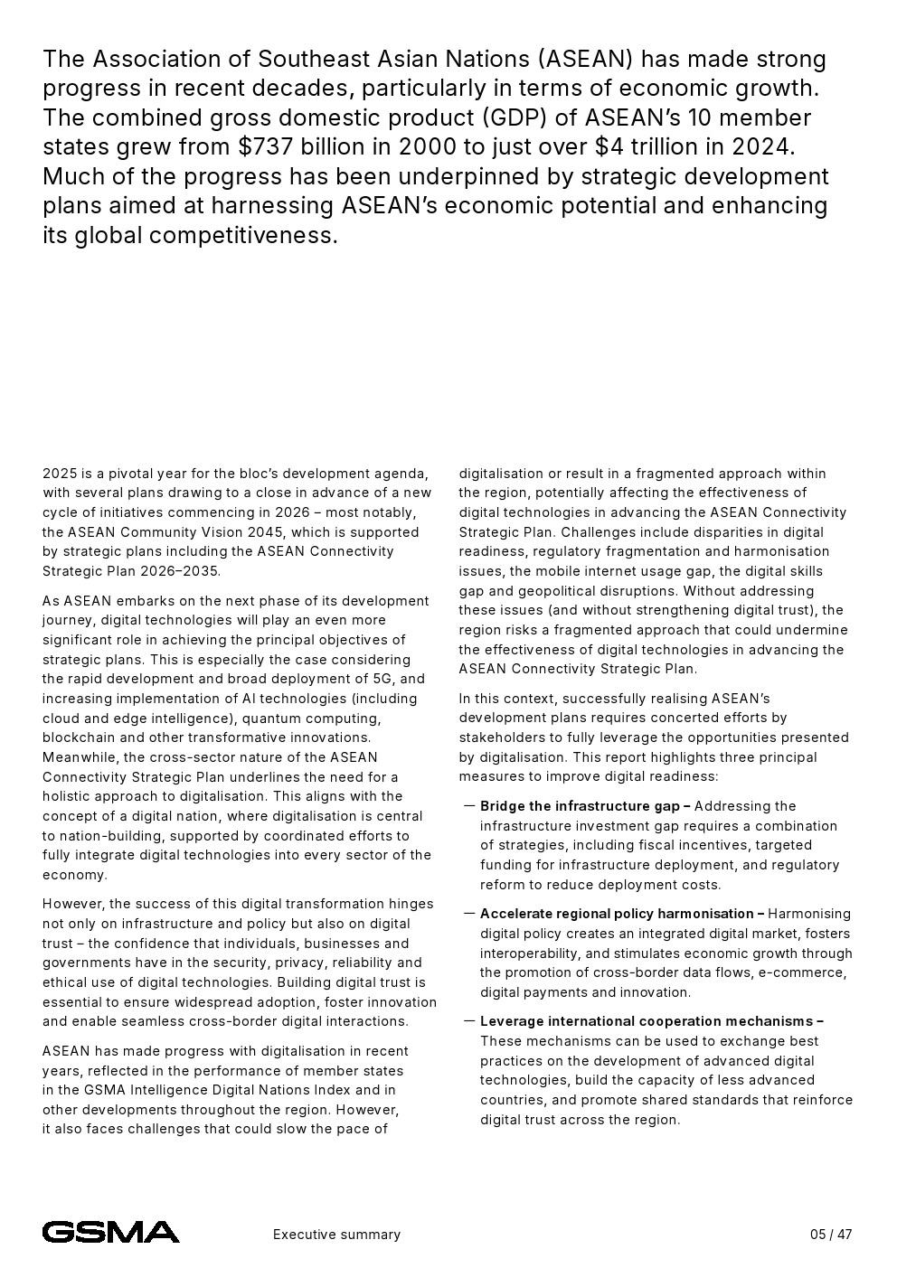 该报告基于GSMA智库的数字国家指数,追溯了东南亚国家联盟自2000年以来的转型,强调了该集团经济总量从7370亿美元增长至2024年的超过4万亿美元——这一增长可通过数字创新实现倍增。