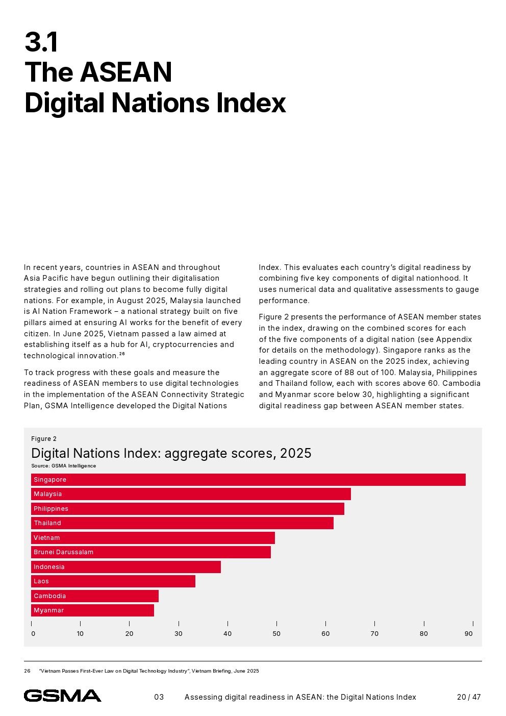 新加坡以总分88分(满分100)领先2025年数字国家指数;马来西亚、菲律宾和泰国各自得分超过60分。