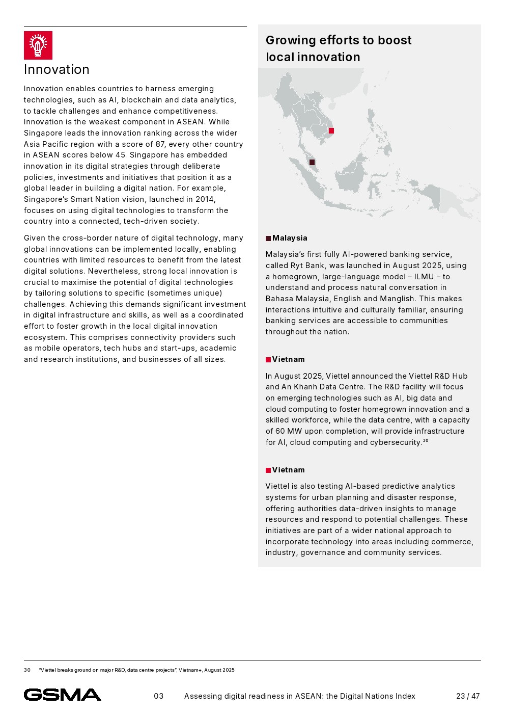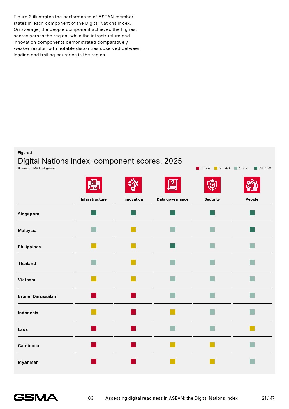 平均而言,”人员”组成部分在东盟范围内表现最强;”基础设施”和”创新”仍然相对较弱。