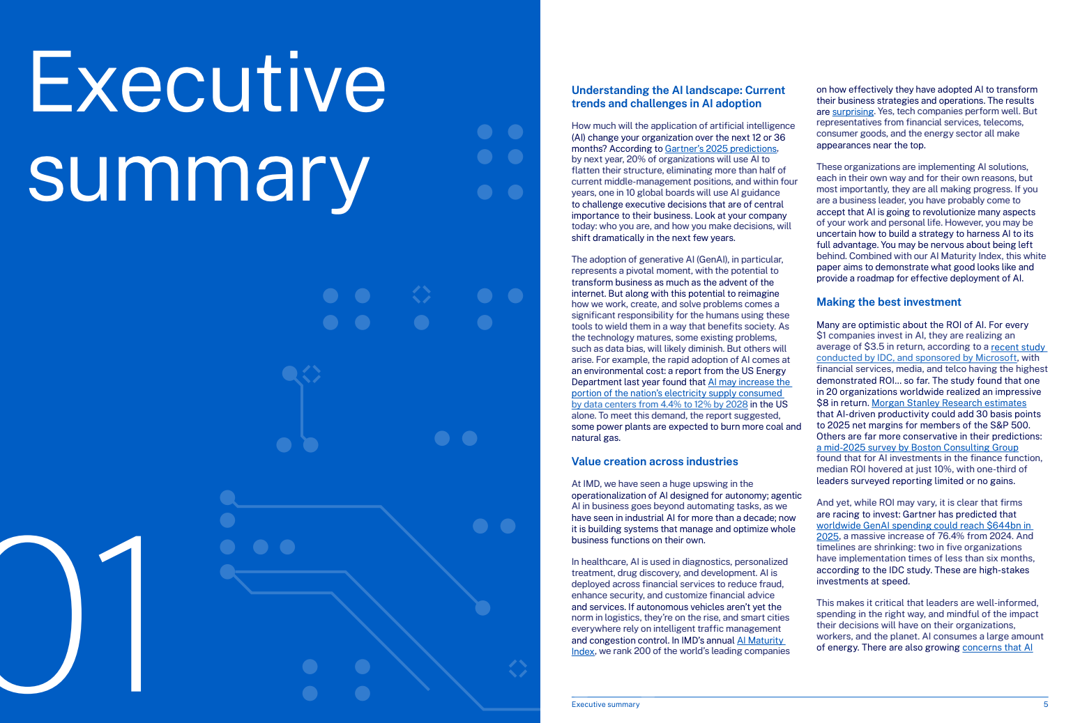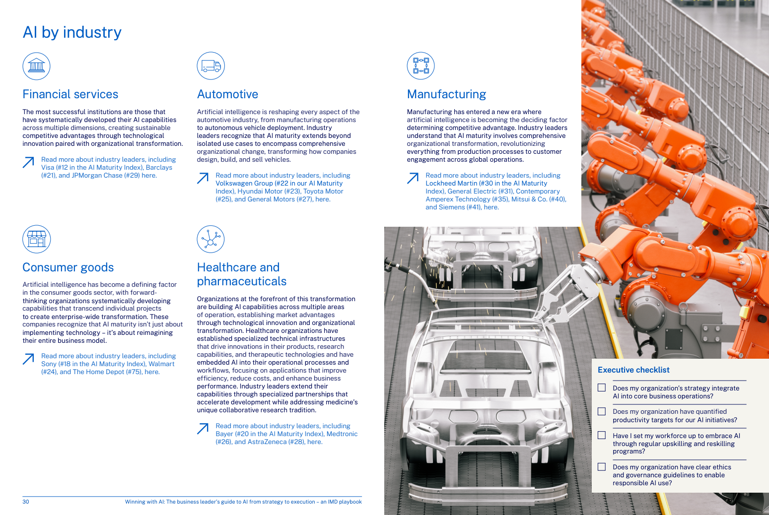 从行业视角看,金融服务、消费品、汽车制造、医疗健康和制造业是AI成熟度最高的领域。领先公司通过构建产业生态、投资云端数据平台和推进员工技能再培训,提升AI在决策支持、风险管理、产品创新中的综合应用能力。