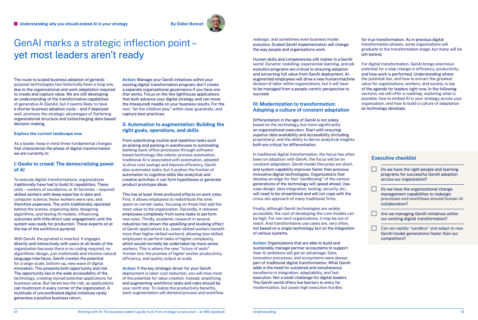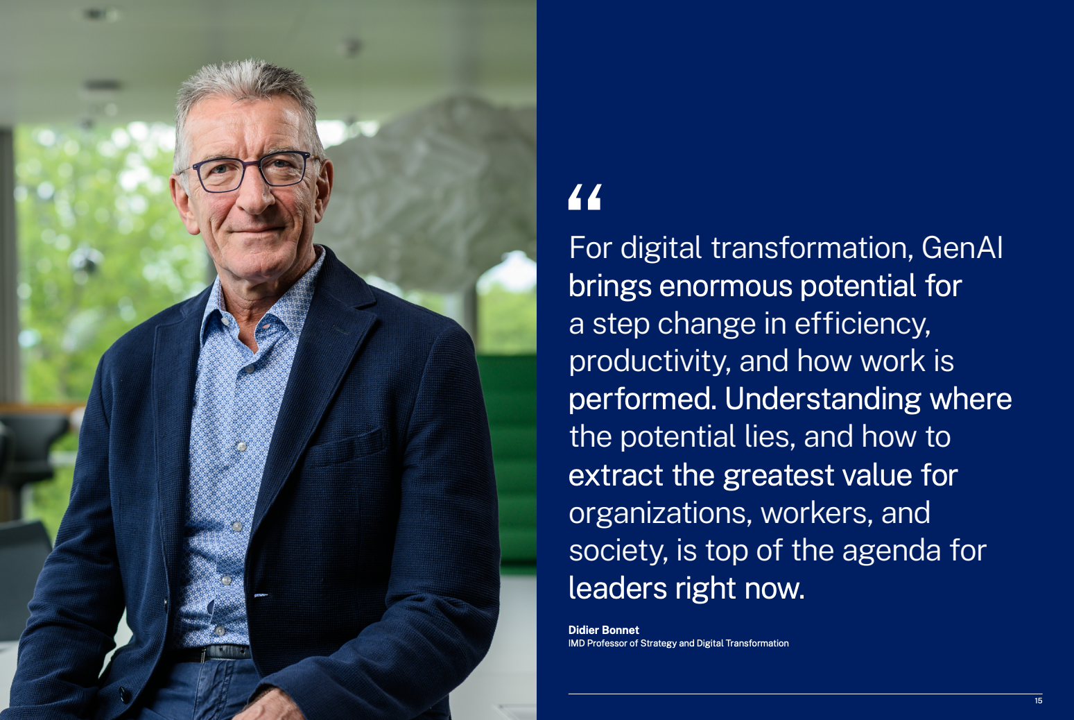 生成式人工智能(GenAI)已成为企业数字化转型的战略转折点,领先企业通过快速采纳GenAI实现组织结构扁平化和数据驱动决策的加速。报告预测,到2026年,20%的组织将通过AI削减超过半数的中层管理职位,展现AI对组织架构的深远影响。