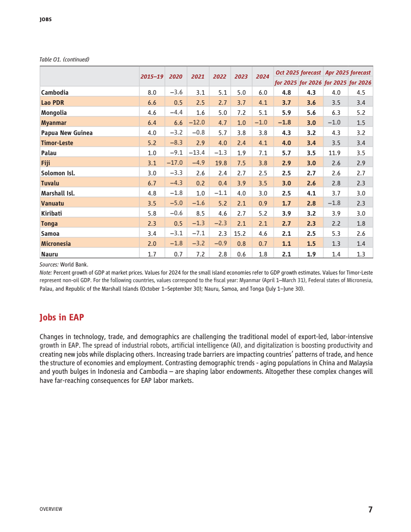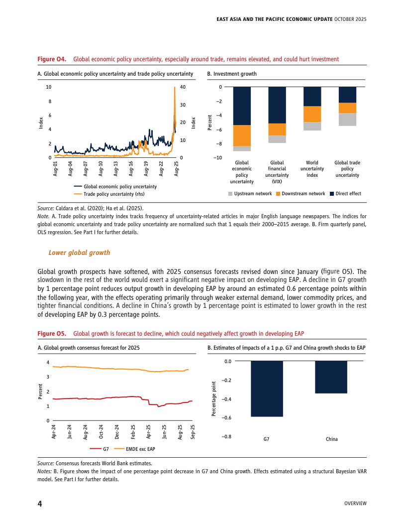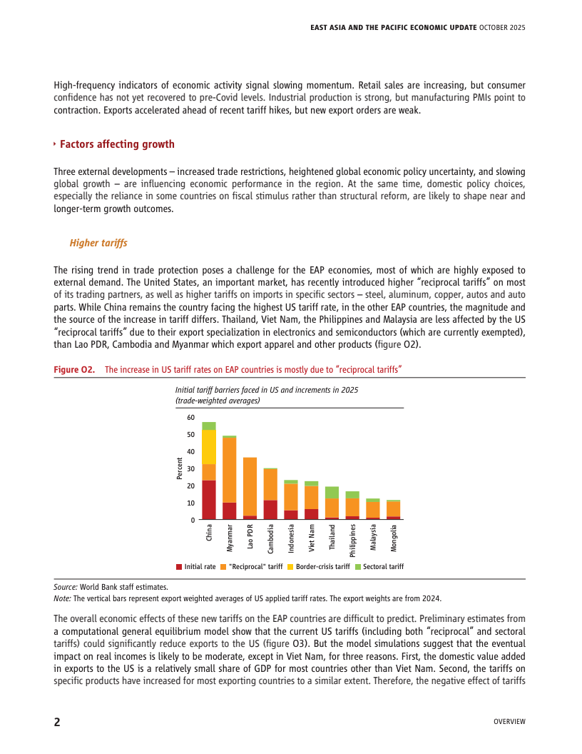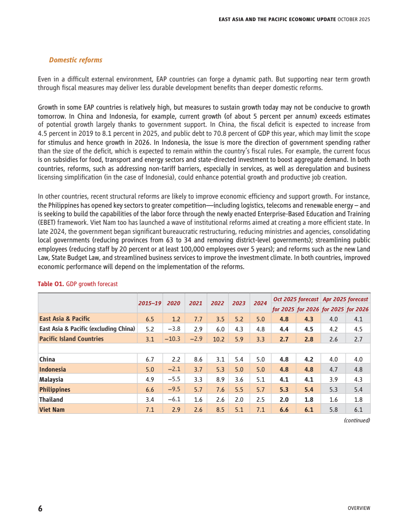 世界银行2025年10月期《东亚与太平洋地区经济半年报》预测,今年该地区经济增速为4.8%,略低于2024年的5.0%。越南以6.6%的增速领先,其次是蒙古(5.9%)和菲律宾(5.3%);中国、柬埔寨和印度尼西亚均预计增长4.8%,太平洋岛国为2.7%,泰国为2.0%。