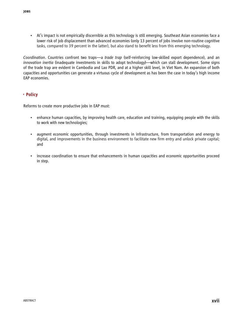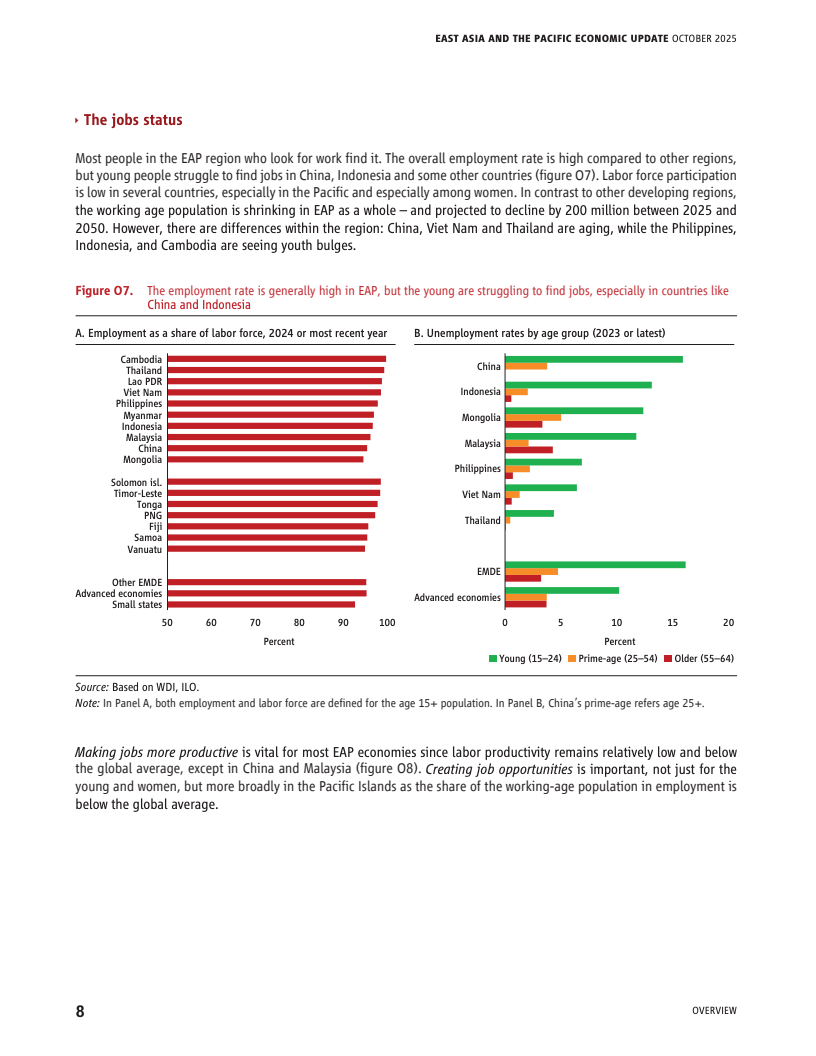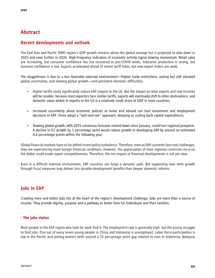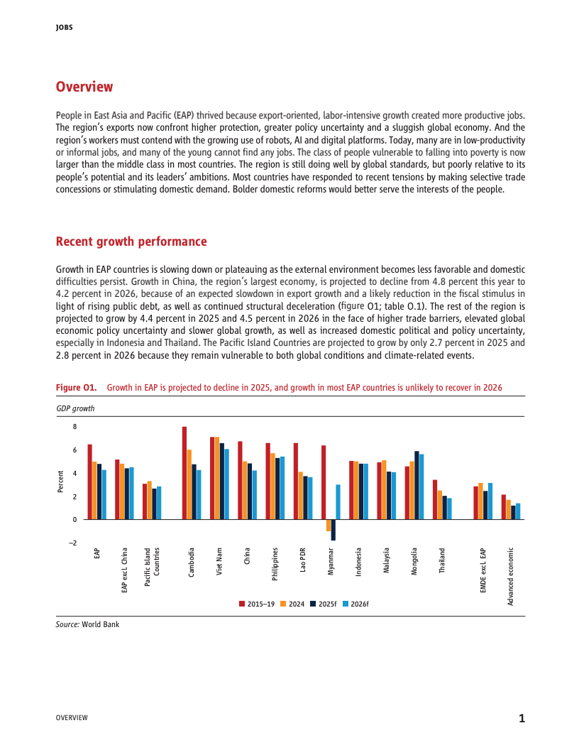 东亚与太平洋地区的经济表现继续好于世界其他大部分地区,但面对当前的全球不确定性,该地区需要推进雄心勃勃的改革,才能创造更多就业机会,保持经济增长。