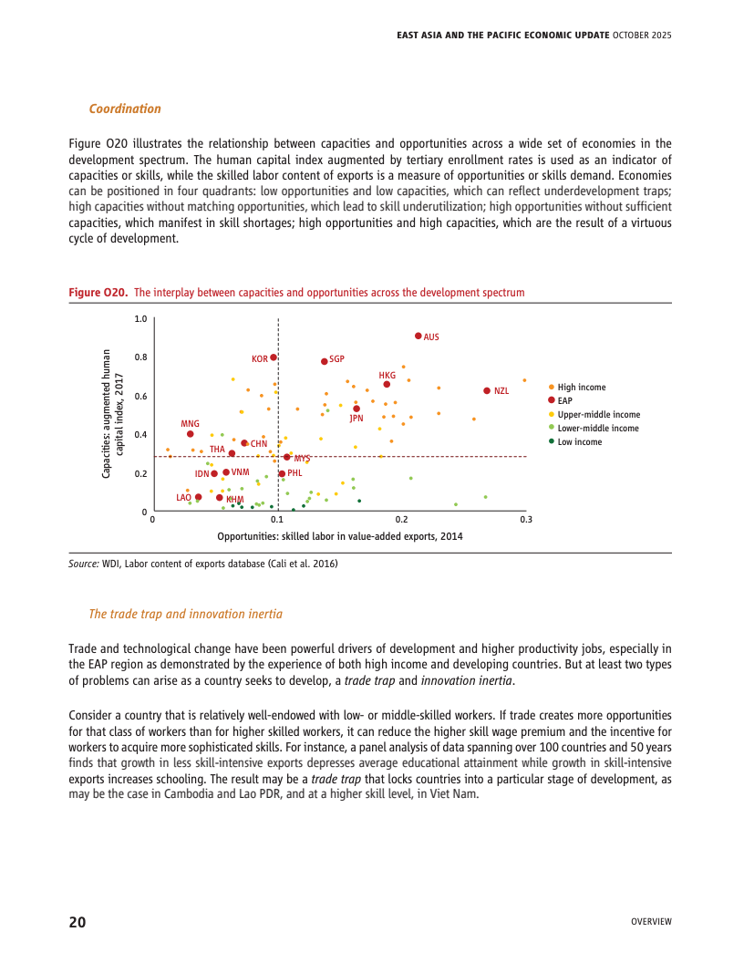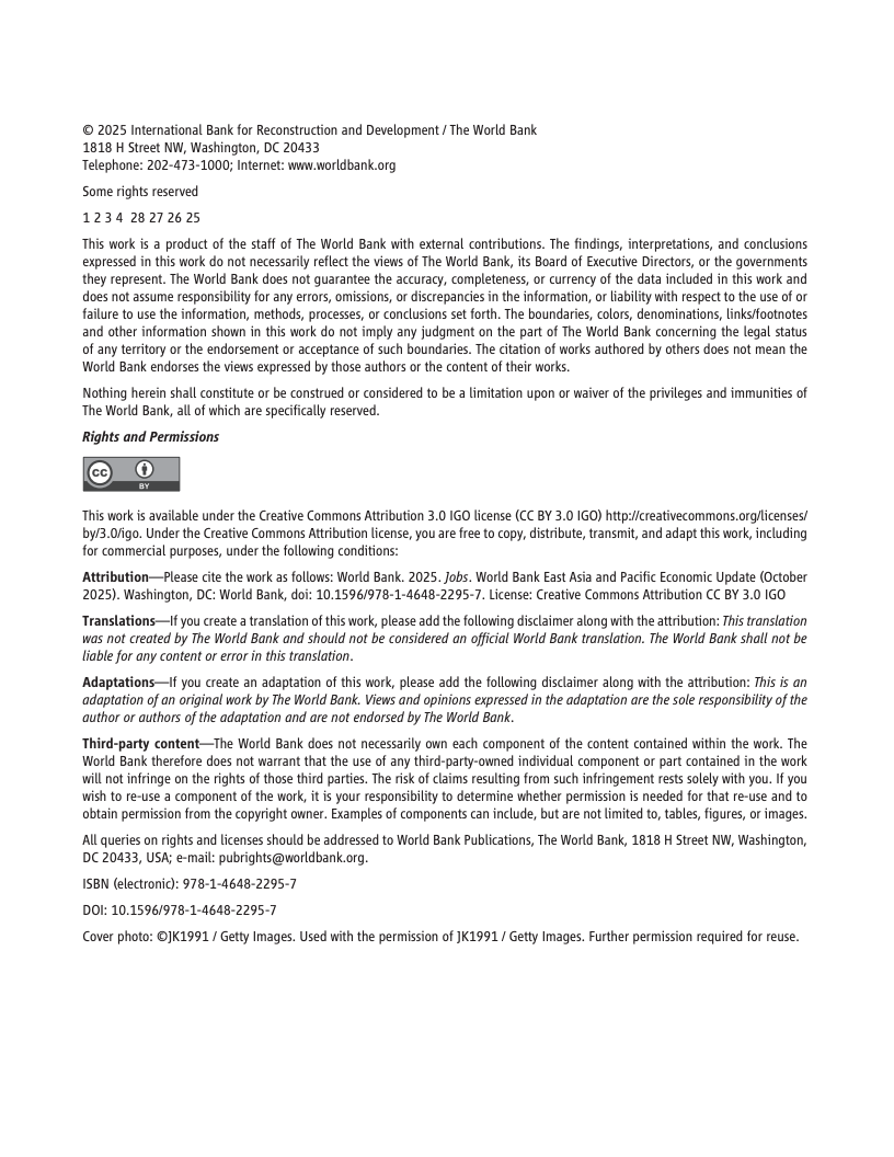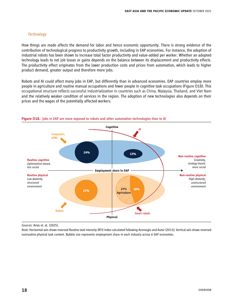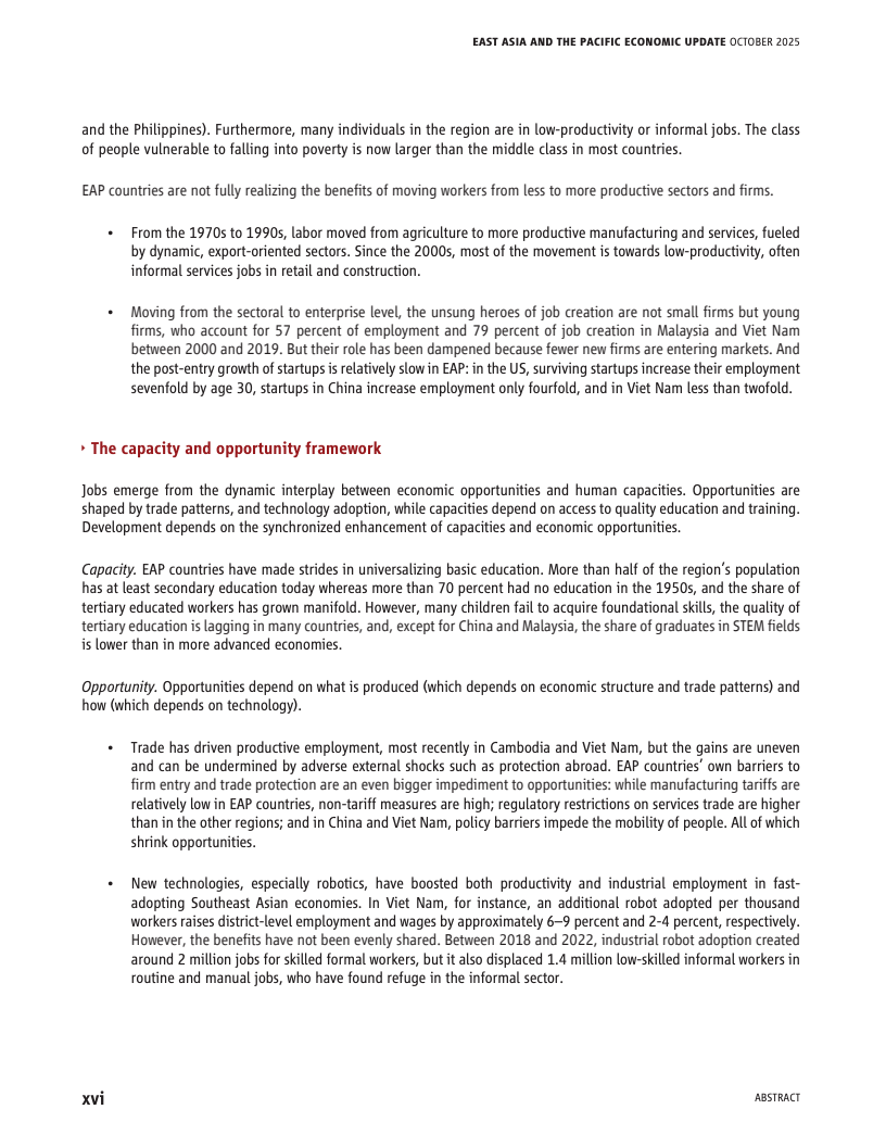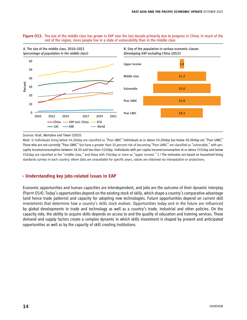 东亚包容性发展的成功模式目前面临新的挑战。近期的就业增长主要集中在低生产率、通常是非正规的服务业岗位,这些岗位提供的发展机会有限。此外,年轻人就业困难,女性劳动力参与率仍然较低。尽管2025至2026年预计将有2500万人摆脱贫困,但在该地区大多数国家,易陷入贫困的人口比例已超过中产阶级。