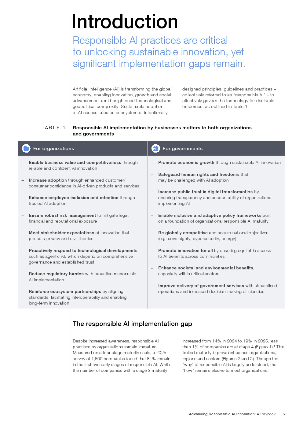 生成式人工智能进入规模化应用阶段,但治理能力明显滞后。报告基于对全球1500家企业的调研显示,2025年仅不足1%的组织实现了“第四阶段”的负责任AI成熟度,即能够以前瞻性、系统性方式管理AI风险,大多数企业仍停留在原则认知或初步落地阶段,这一“实施鸿沟”正在削弱AI投资信心与社会信任 。