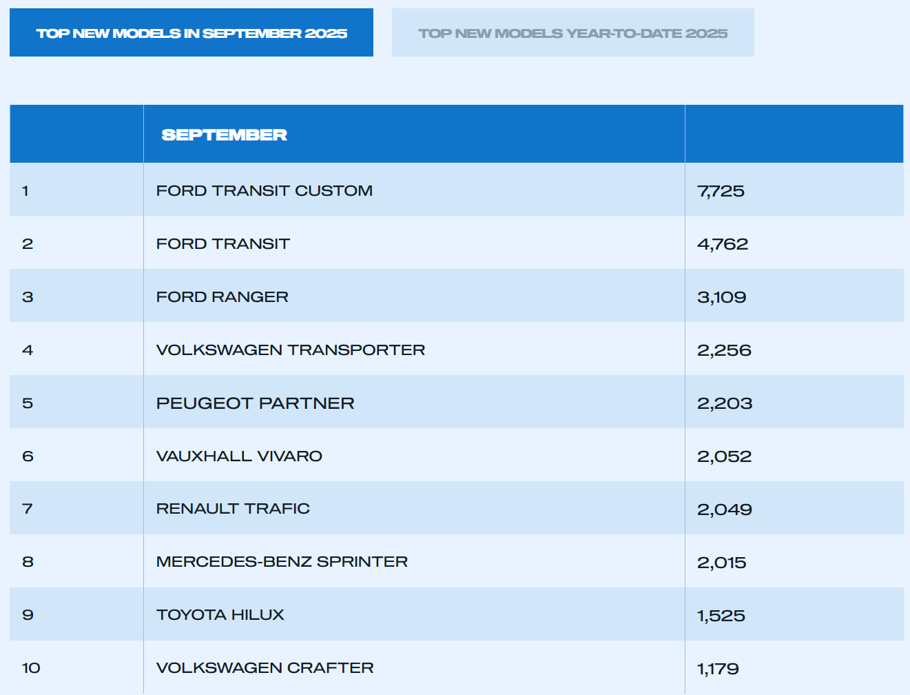 英国新型轻型商用车(LCV)九月份交付量下降2.1%,注册量为47,418辆厢式货车、皮卡和四驱车。
