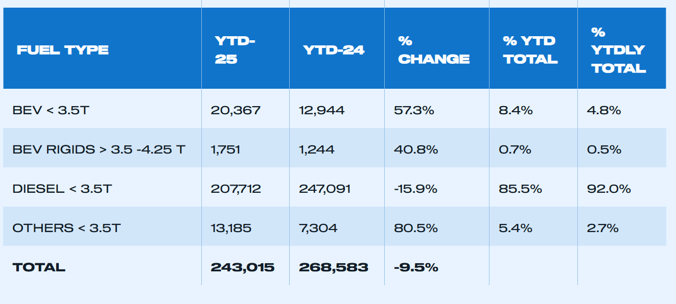 新型电动厢式货车(EV)注册量继续保持强劲上升势头,同比增长41.1%,达到4,262辆——这是有记录以来单月最高值,市场份额达到8.9%。截至目前的纯电动厢式货车销量现为22,118辆,较2024年增长55.9%,占所有新注册量的9.1%。这在整体市场面临困境的一年中是令人印象深刻的增长,但仍远低于2025年规定的16%份额目标。制造商正在推动这一增长,大力投资电动厢式货车车型,目前为车队运营商提供了超过40种选择。