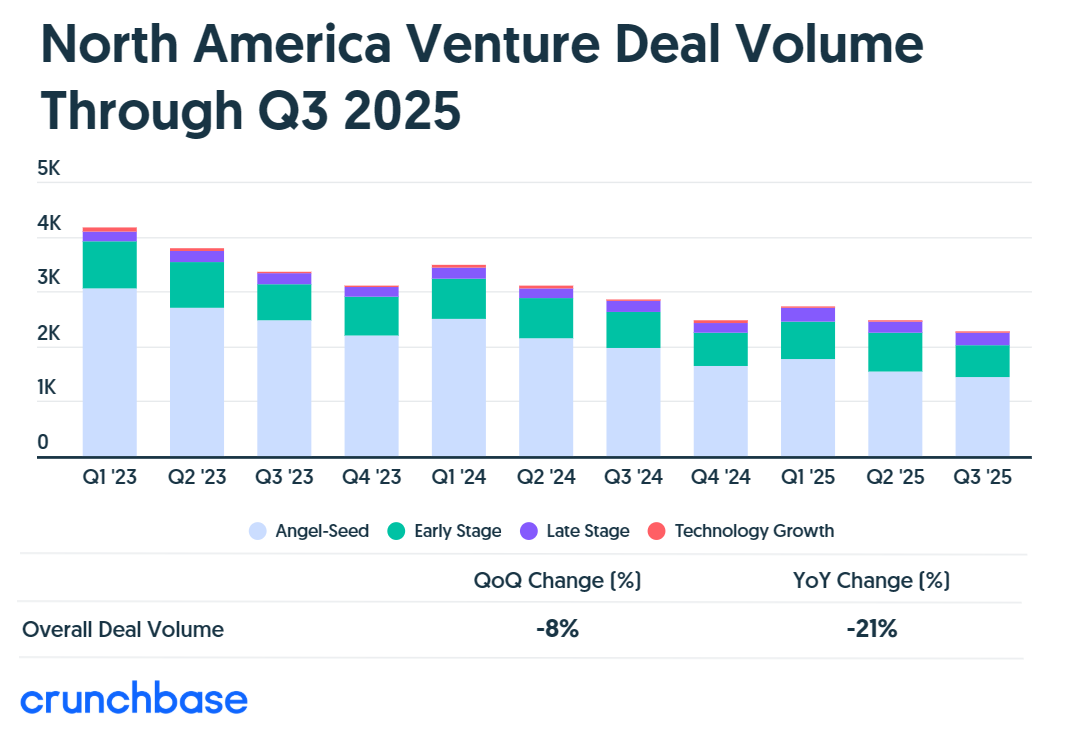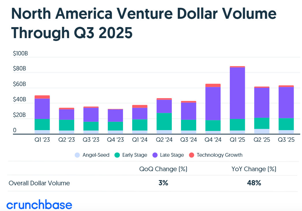根据Crunchbase数据,投资者在第三季度向美国和加拿大公司报告的种子期至成长期轮次投入了631亿美元。这较上一季度略有增长。然而,它远高于去年同期水平,增加了超过200亿美元的资金。