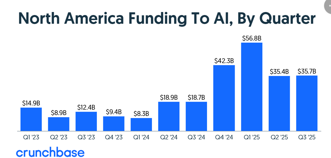 除了更加高度集中之外,过去一个季度的交易活动也严重以AI为中心。根据Crunchbase数据,大约57%的北美资金流向了AI相关类别的公司。这包括了该季度最大规模的投资轮——Anthropic的130亿美元F轮投资,仅此一项就占上季度该地区初创企业总投资的1/5以上。