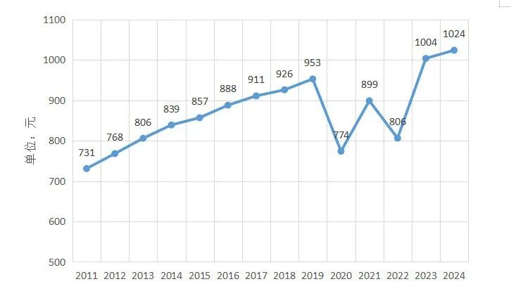 2024年国内旅游人均每次旅游消费1024.04元,比2023年的1003.88元增加20.16元,增长2.0%。其中,城镇居民人均每次旅游消费1128.15元,比2023年的1112.29元增长1.4%;农村居民人均每次旅游消费666.67元,比2023年的653.13元增长2.1%。