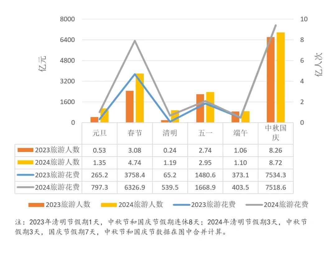 随着人们生活水平的提高和休闲意识的增强,每逢节假日,大量民众选择出游。2024年的元旦、春节、清明、五一、端午、中秋国庆等节假日,全国旅游出游人数比2023年分别增长了154.7%、53.9%、395.8%、7.7%、3.8%、5.6%。