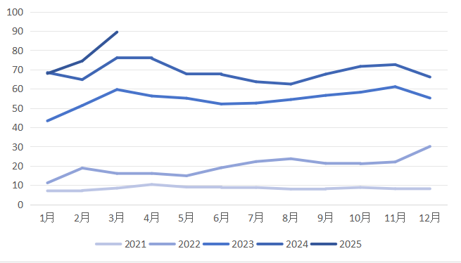 图3 2021-2025年(1-3月)海外民众对来华航班和住宿的月均日搜索指数 数据来源:谷歌旅行洞察Travel Insights with Google