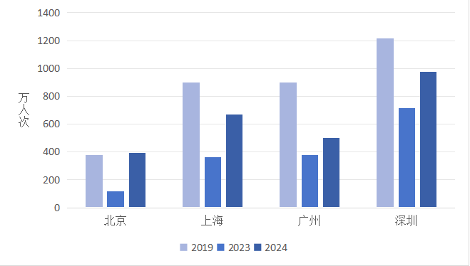 图2 北上广深四个城市2019、2023和2024年入境游客接待情况 数据来源:各市公开旅游统计数据 注:北京市2019和2023年的数据为入境过夜数据;广州和深圳的数据均为入境过夜数据