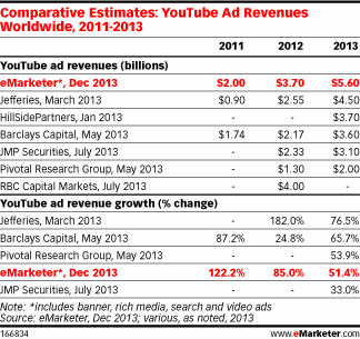 eMarkete从研究公司、投资银行、公司报告和对行业高管就发展数据的采访收集来的关于YouTube的收入、广告效果、比例、使用和其他因素的成百上千的数据和研究报告进行分析。