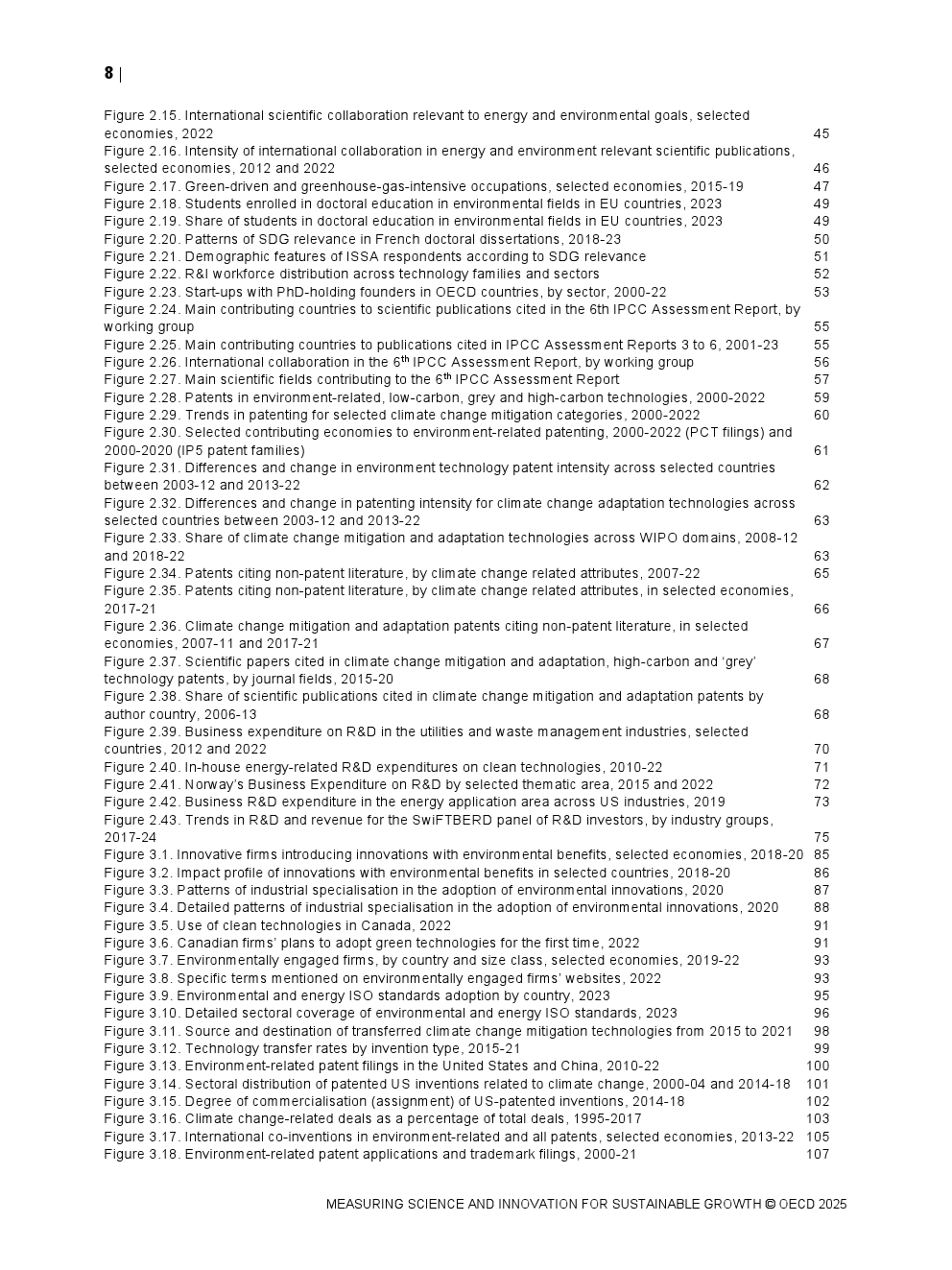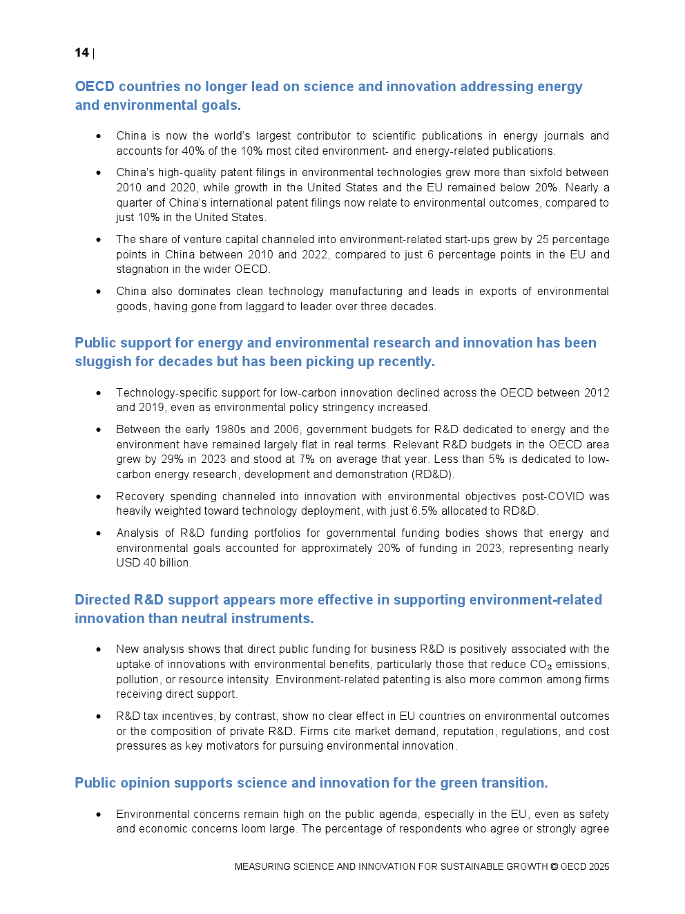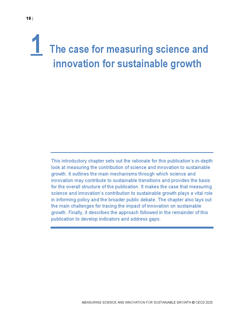 OECD发布了“衡量科学和创新促进可持续增长”。科学、技术与创新(STI)的变革力量对于在应对气候变化、污染和生物多样性丧失等全球重大环境挑战的同时扩展经济福祉是必要的。然而,为有效利用和引导这种力量,政策制定者需要适合的衡量标准,以捕捉科学和创新的多层面贡献、不同行为者所扮演的角色以及相关政策的影响。报告提供了关于科学和创新对资源与环境可持续性作用的新且全面的证据。它利用现有统计数据和新开发的数据库、指标及分析,绘制关键趋势和结构性问题,比较各国在这一重要行业的能力,为决策提供信息。收集到的证据得出以下见解: