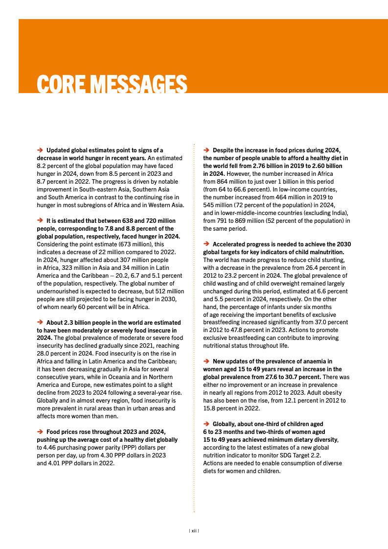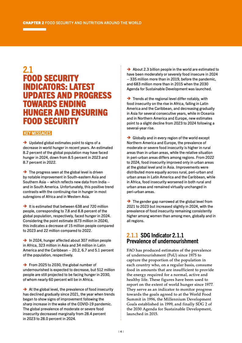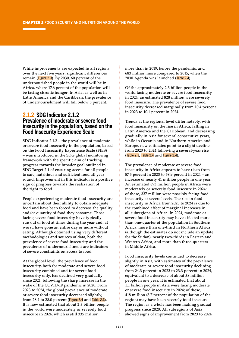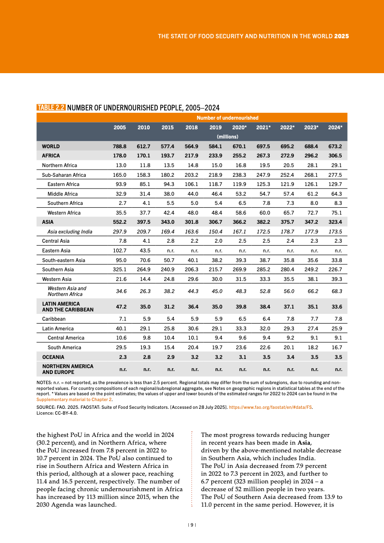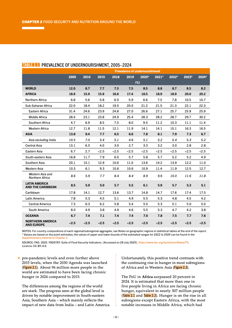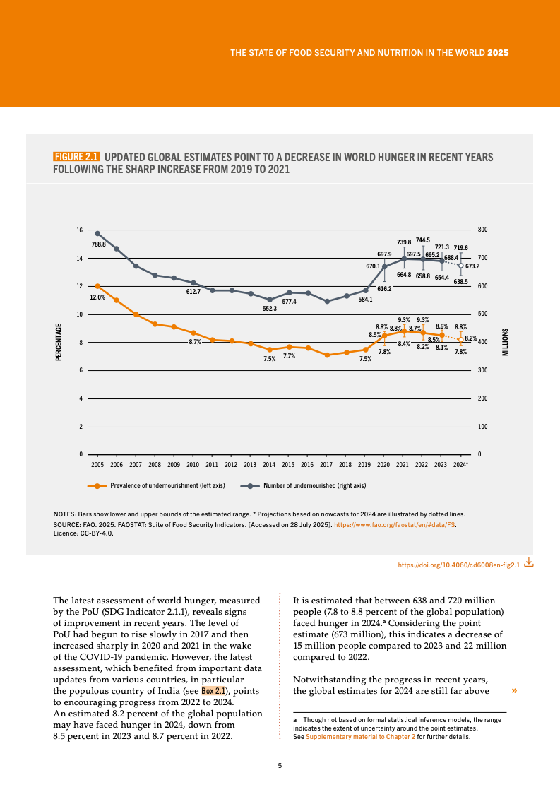 全球粮食安全形势依然严峻。根据联合国粮农组织的最新数据,2024年全球饥饿人口比例为8.2%,相当于每12人中就有1人面临饥饿,总数约7亿人。尽管该比例较2022年的8.7%略有下降,但整体基数仍然庞大,且有近23亿人面临中度或重度的粮食不安全问题。
