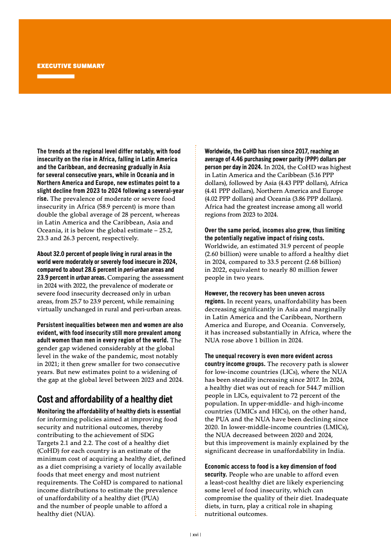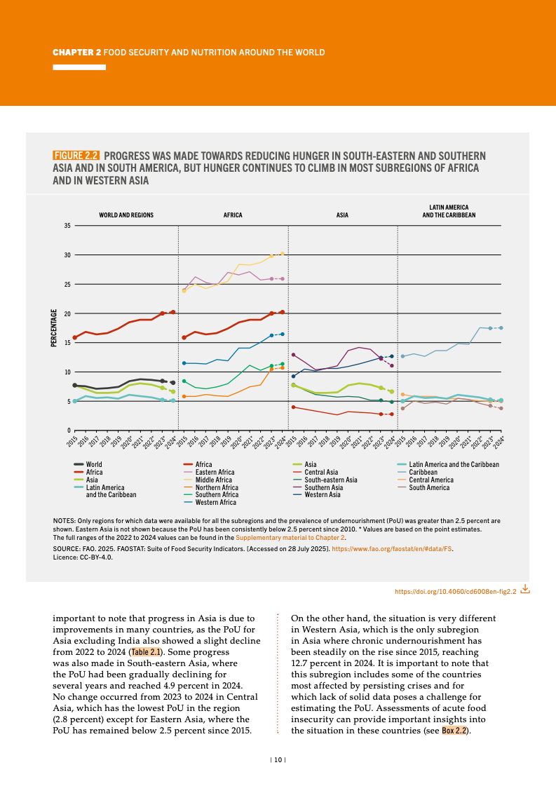 区域性差异显著,低收入经济体承受了不成比例的压力。数据显示,2024年非洲的营养不良率上升超过20%,西亚地区则上升了12.7%。这表明全球粮食不安全问题在特定地区正呈现恶化趋势,而非普遍改善,凸显了资源分配与应对策略的区域不平衡。