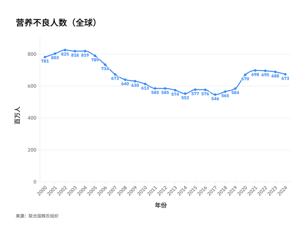 粮农组织在其2025年关于粮食安全的年度报告中指出,自新冠疫情以来,全球饥饿比例已经再次逐步下降,从2022年占世界人口的8.7%降至2024年的8.2%(相当于每12人中有1人)。这意味着仍有约7亿人面临饥饿。此外,超过四分之一、即近23亿人去年面临中度或重度的粮食不安全;在6-23个月龄的婴幼儿中,只有34%在维生素和矿物质方面达到最低膳食标准。
