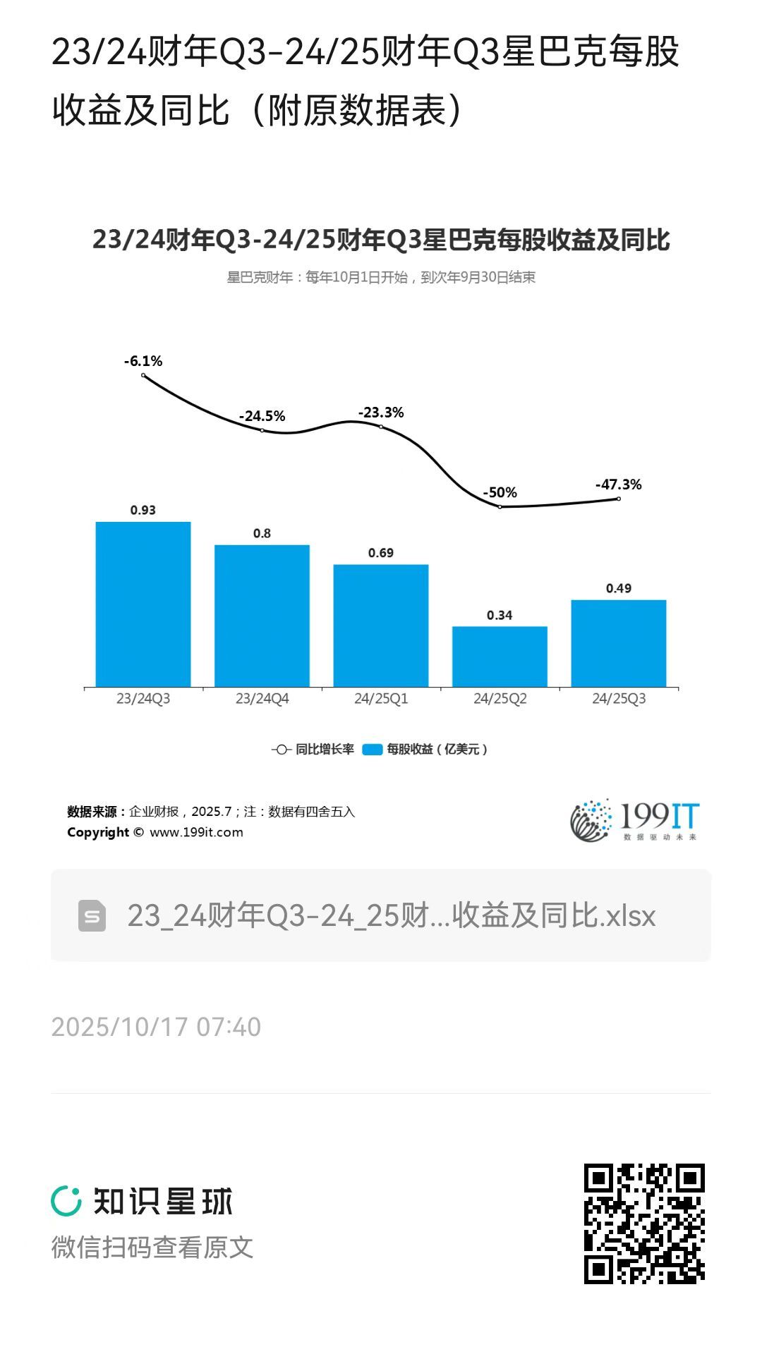 23/24财年Q3-24/25财年Q3星巴克每股收益及同比(附原数据表) ​​​