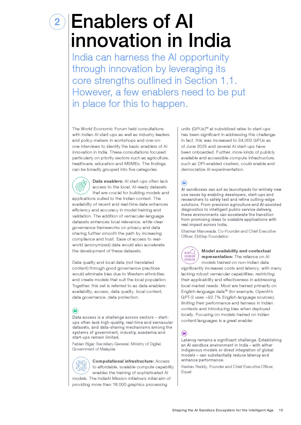 印度独具优势,能够引领这场变革。凭借强大的数字公共基础设施、充满活力的初创企业生态系统以及庞大的多语言人口,该国为构建和推广既能应对国内优先事项又能解决全球挑战的AI解决方案提供了理想的试验场。然而,印度仍面临一些结构性挑战——包括获取本地化数据集和计算基础设施的机会有限、缺乏标准的验证框架,以及对早期初创企业的支持不足。