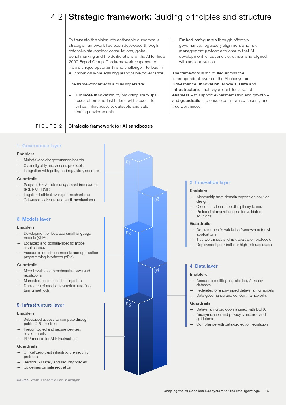 一个战略框架,概述了AI沙盒生态系统的五个核心层——基础设施、数据、模型、创新和治理——每一层都嵌入了创建AI解决方案的赋能要素和负责任部署的防护措施。