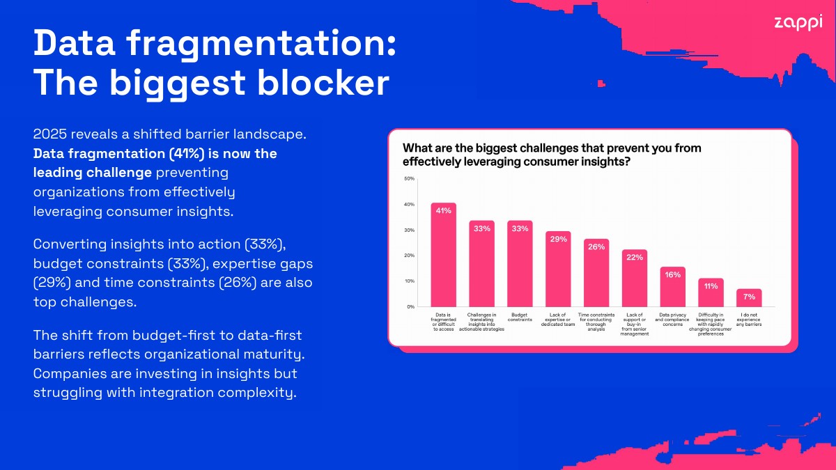 报告指出,公司正在加大对洞察的投资,并且随着这种成熟度的提高,他们的关键挑战正在转变。去年,预算限制是阻碍受访者有效利用消费者洞察的主要障碍,而今年受访者提及的最大问题是数据碎片化或难以访问(41%)。这让人联想到另一项研究,该研究发现营销人员表示,阻碍其营销团队实现全部数据和洞察潜力的最大绊脚石是难以将不同来源的数据连接在一起。