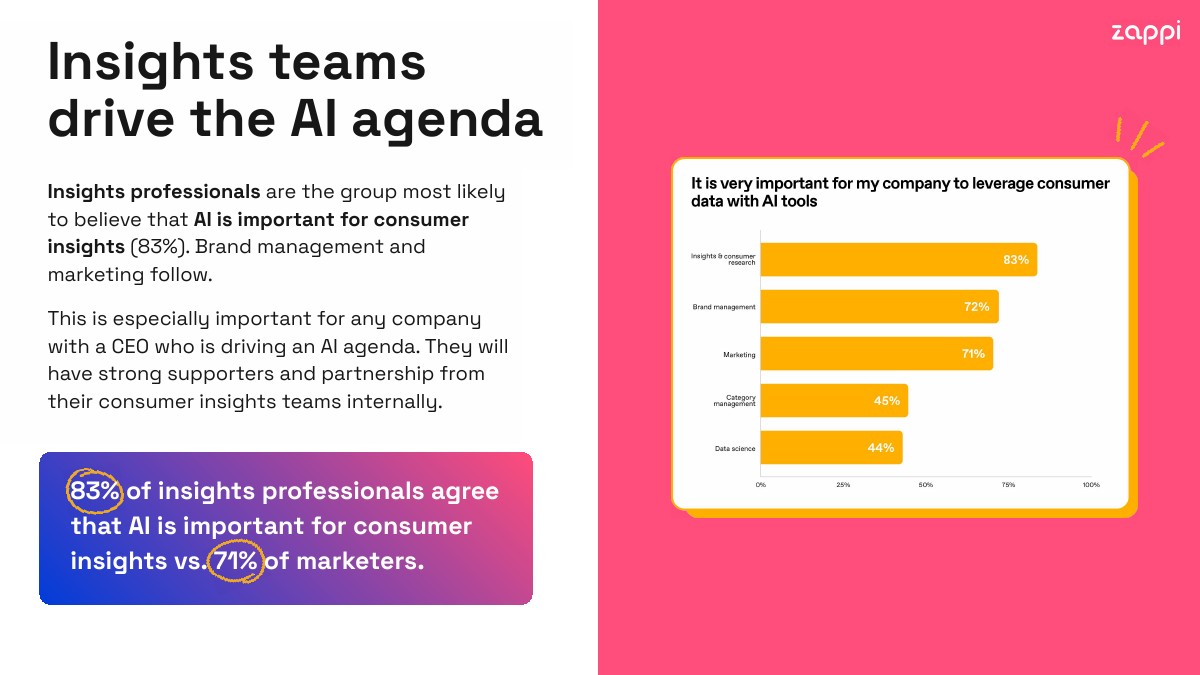 至于人工智能,83%的洞察和消费者研究专业人士认为其公司利用AI工具处理消费者数据非常重要,71%的营销人员对此表示同意。