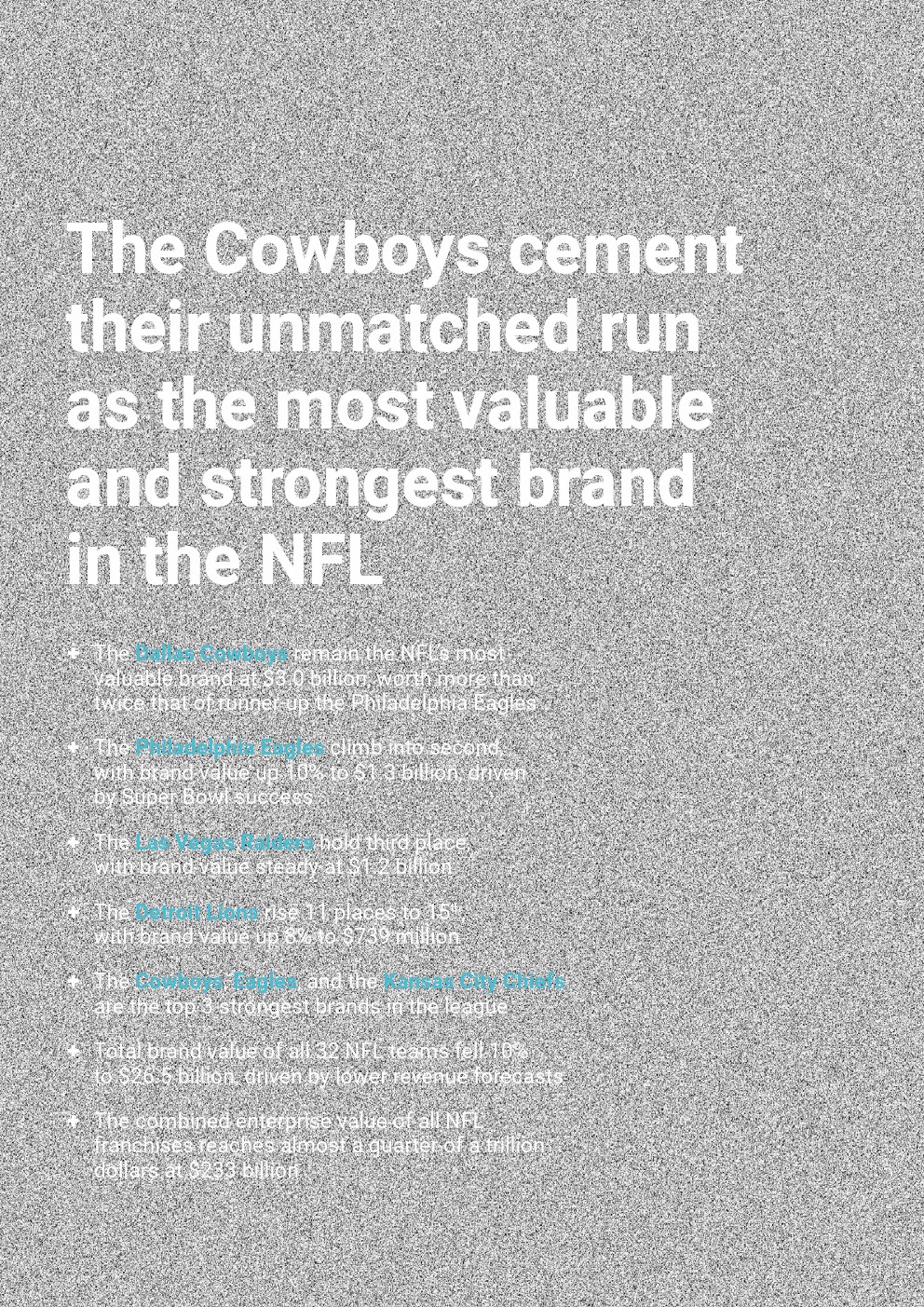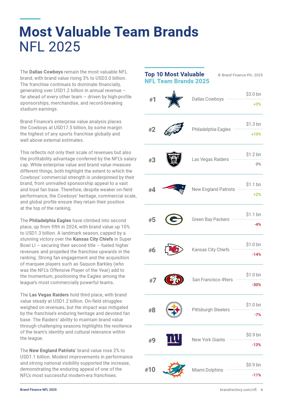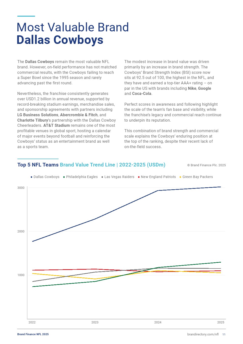 达拉斯牛仔队继续保持其作为最具价值NFL品牌的地位,品牌价值增长3%,达到30亿美元。该俱乐部在财务上持续占据主导地位,年收入超过12亿美元——远高于其他所有球队——这得益于高规格的赞助、商品销售以及破纪录的体育场收入。