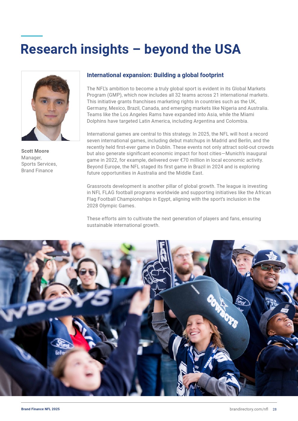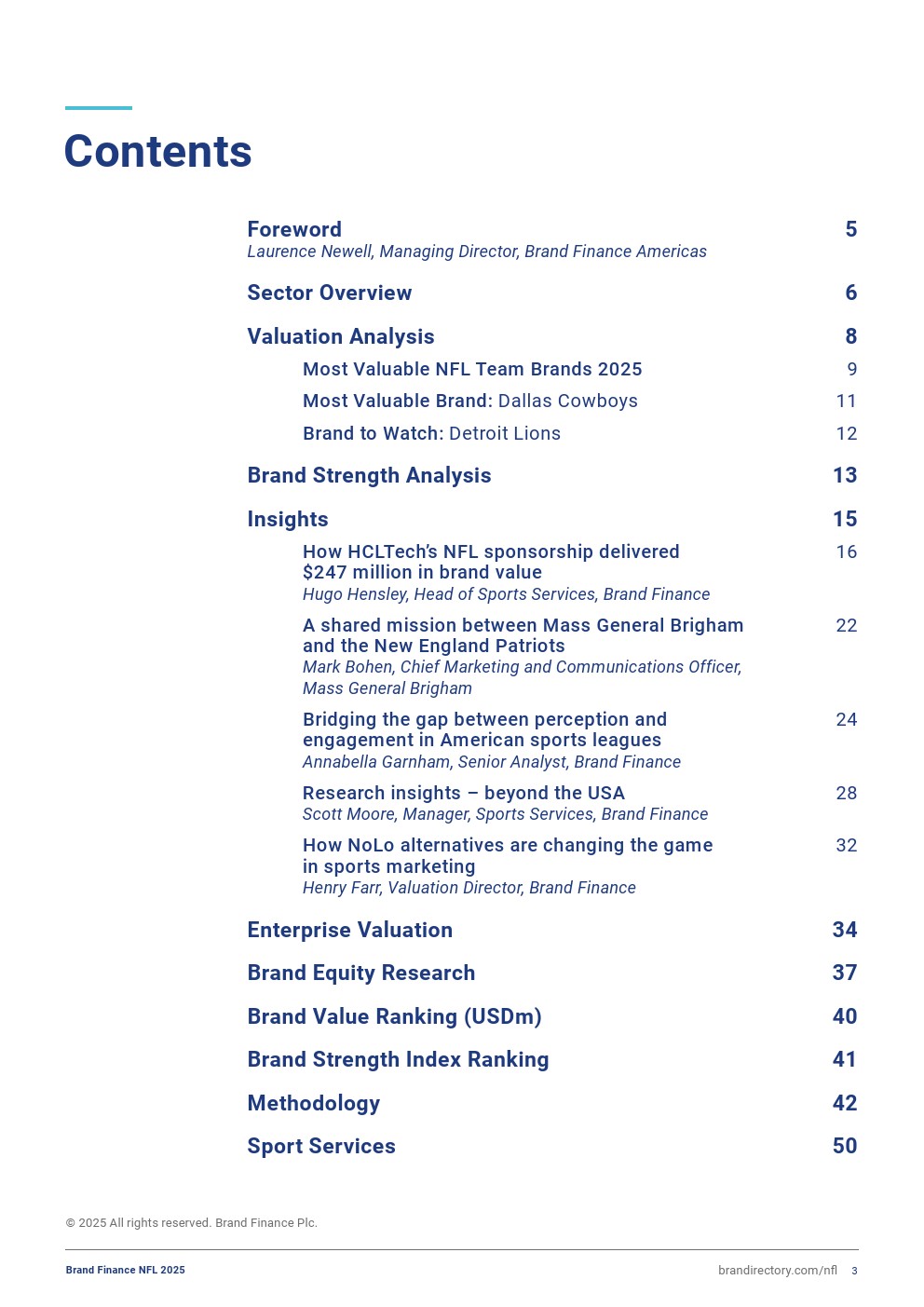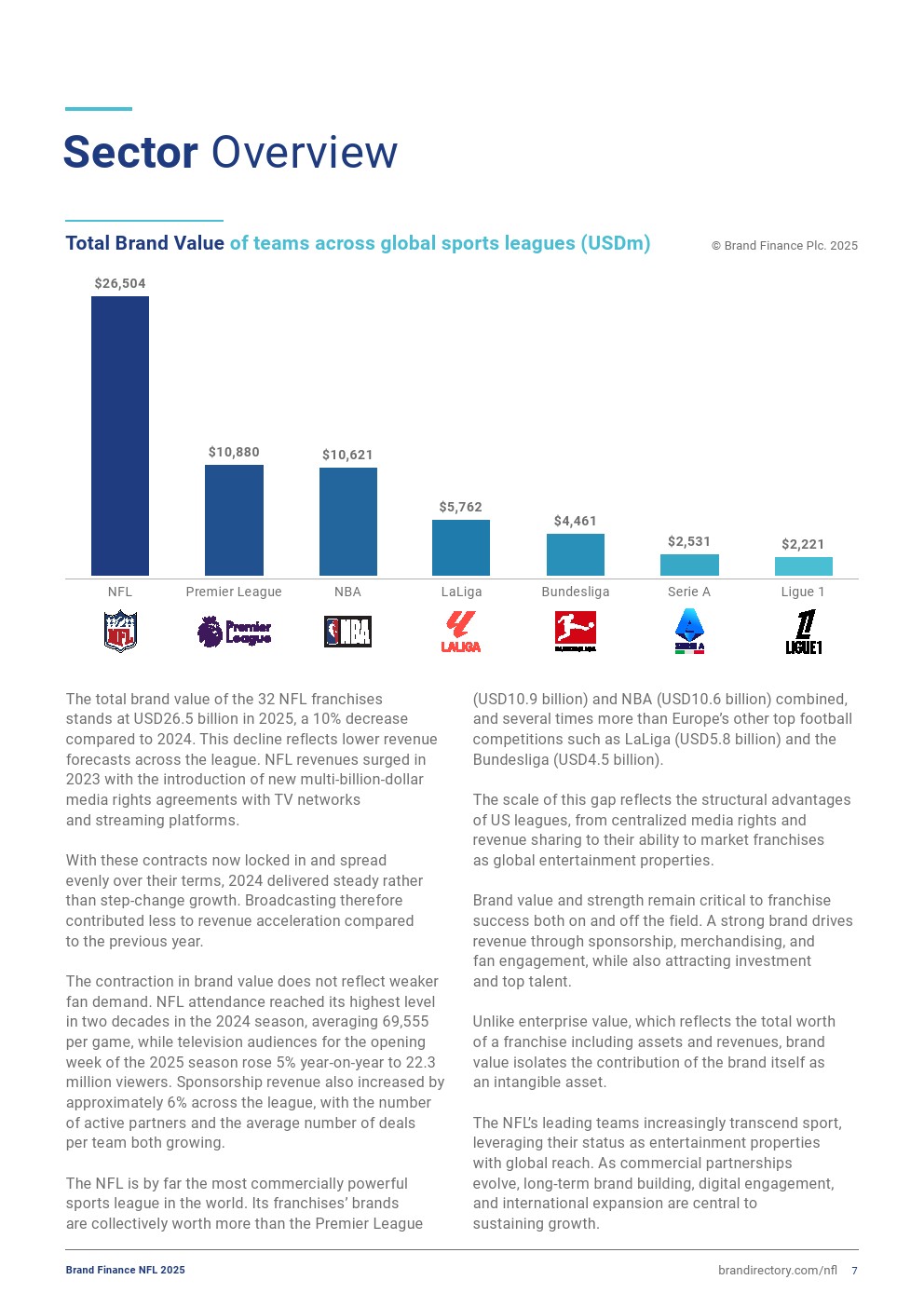 达拉斯牛仔队继续保持其作为最具价值NFL品牌的地位,品牌价值增长3%,达到30亿美元。该俱乐部在财务上持续占据主导地位,年收入超过12亿美元——远高于其他所有球队——这得益于高规格的赞助、商品销售以及破纪录的体育场收入。