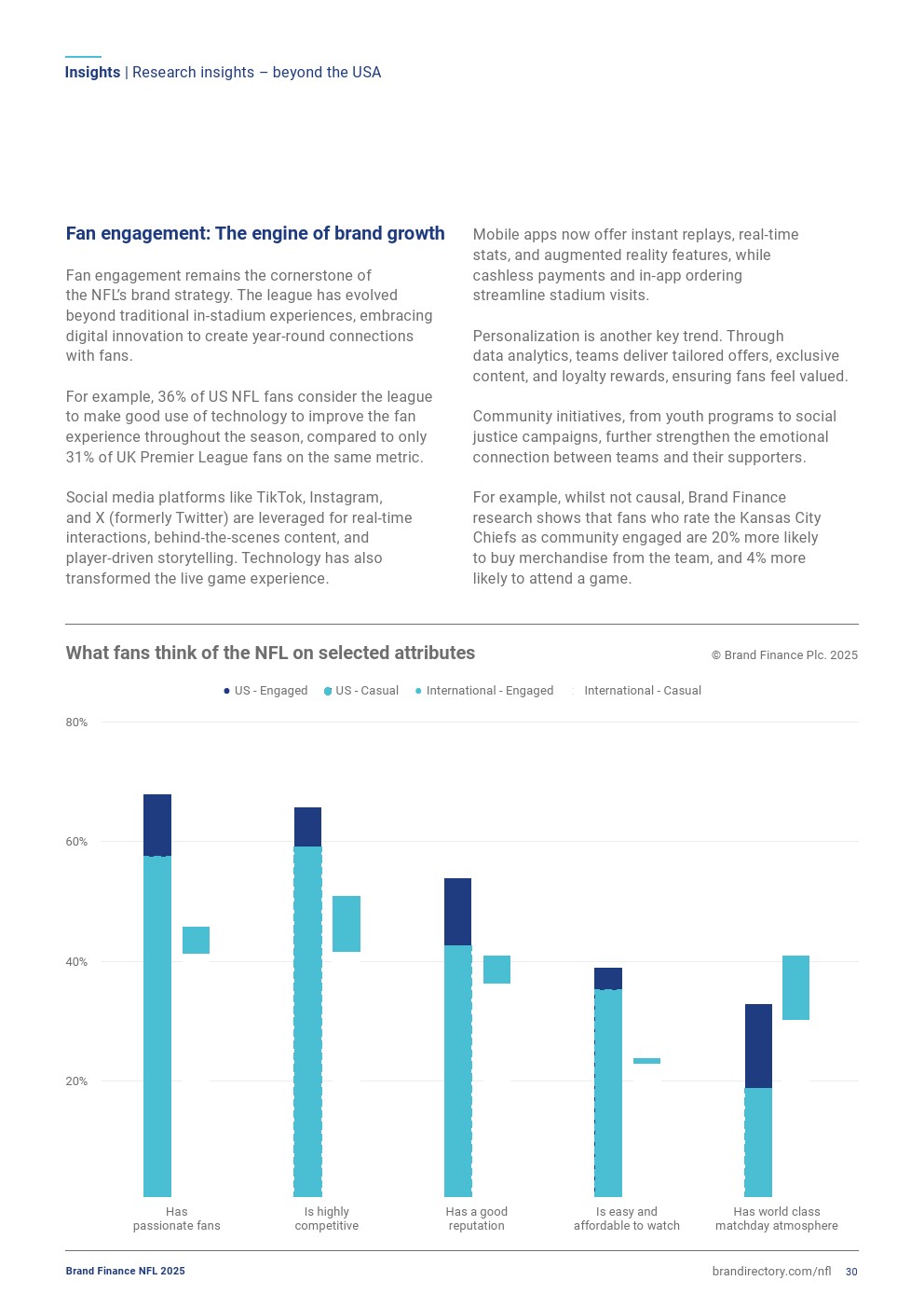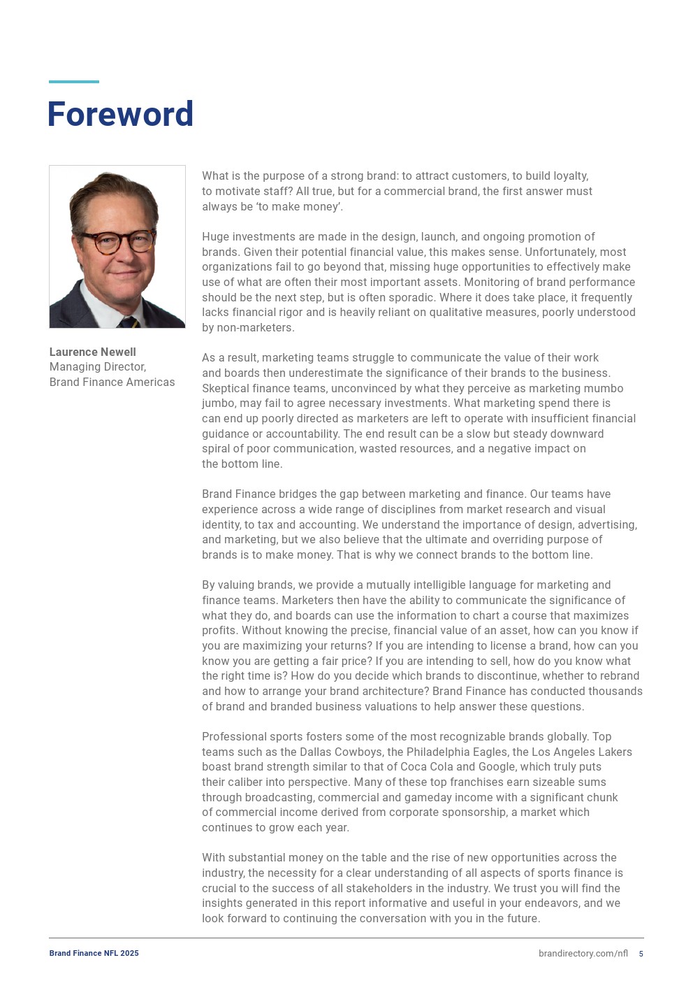 同时,NFL的媒体版权收入已纳入长期合同,与最初签署协议时出现的阶跃式增长相比,提供了更稳定但更温和的年增长。因此,预测中采用了略低的增长率,尽管今年品牌强度指数得分提高了三分,但仍导致了品牌价值的下降。包装工队传奇的历史和忠实的粉丝社区仍然是支撑其长期品牌实力的关键资产。