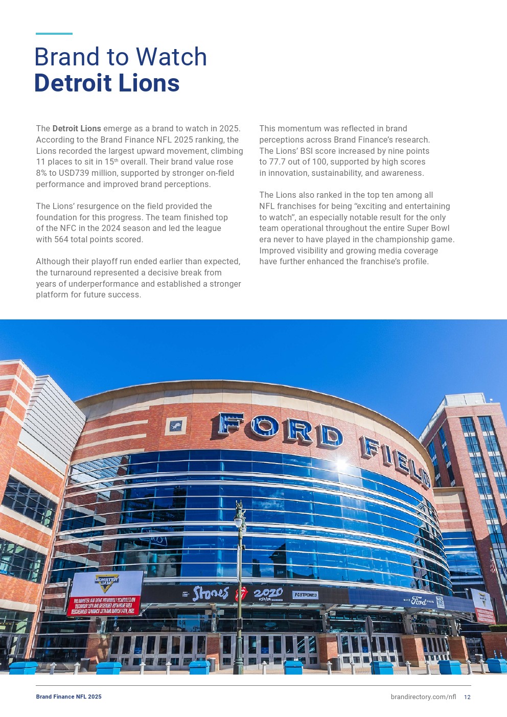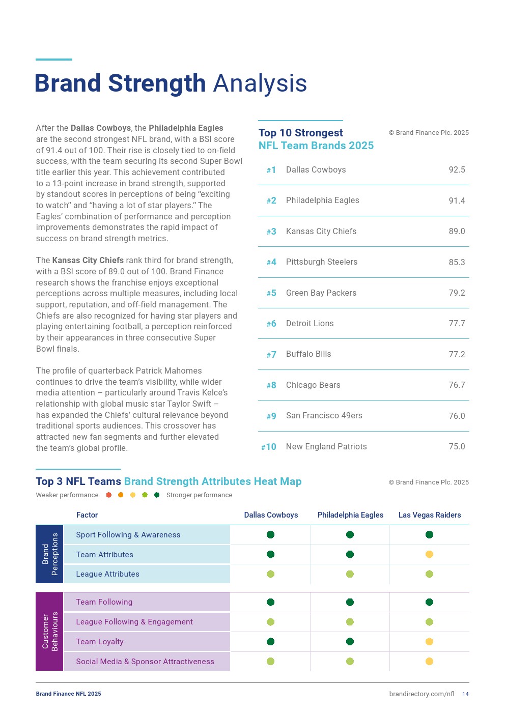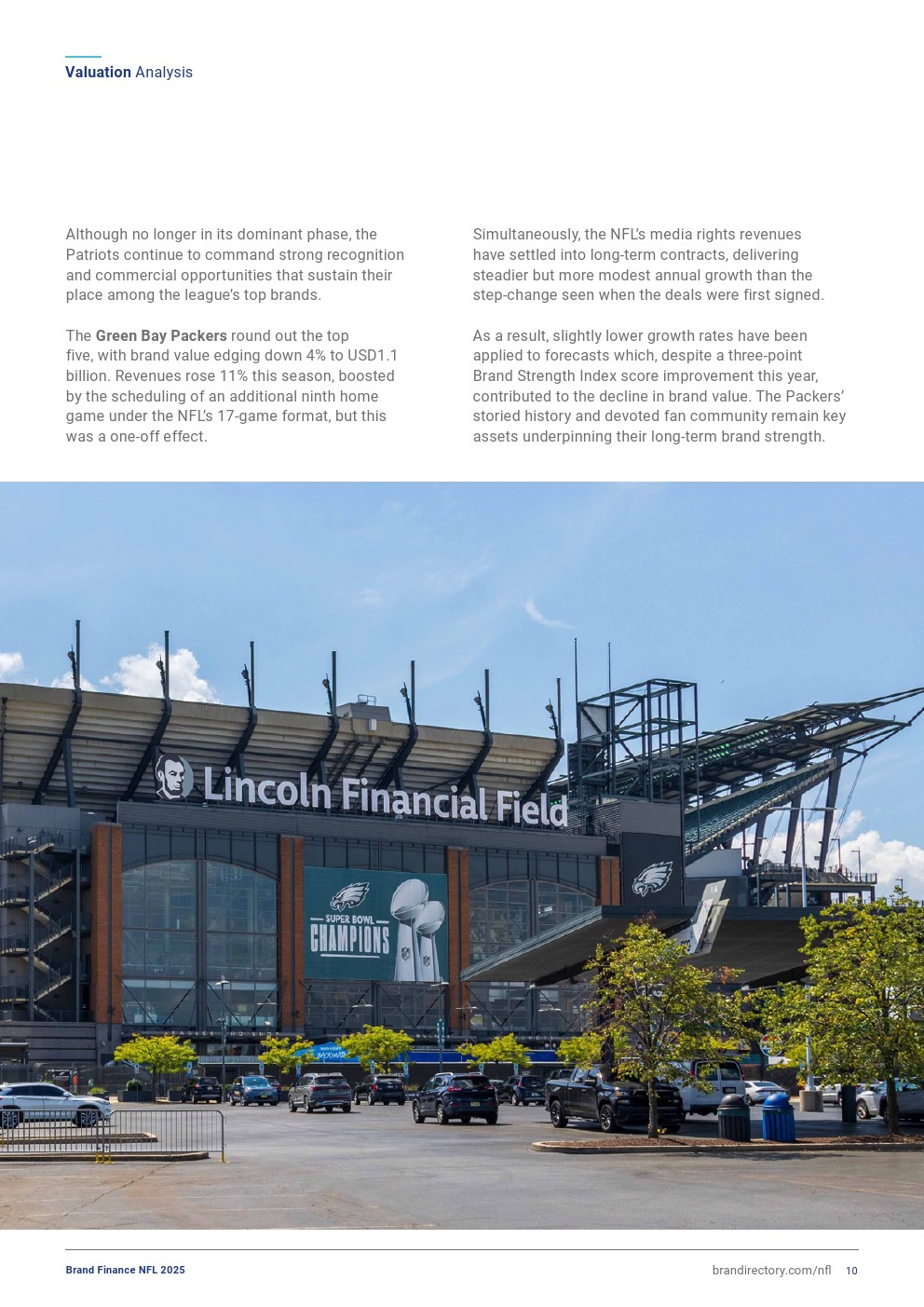 费城老鹰队从2024年的第五位升至第二位,品牌价值增长10%,达到13亿美元。一个具有里程碑意义的赛季,包括在超级碗LI中击败堪萨斯城酋长队夺得冠军——这是他们的第二个冠军——推动了收入增长,并促使该俱乐部在排名中上升。强大的粉丝参与度以及收购像Saquon Barkley(NFL年度最佳进攻球员)这样的明星球员增加了势头,使老鹰队跻身于联盟中商业实力最强的球队之列。