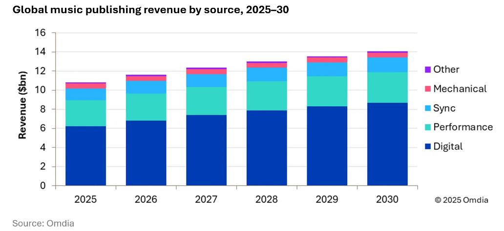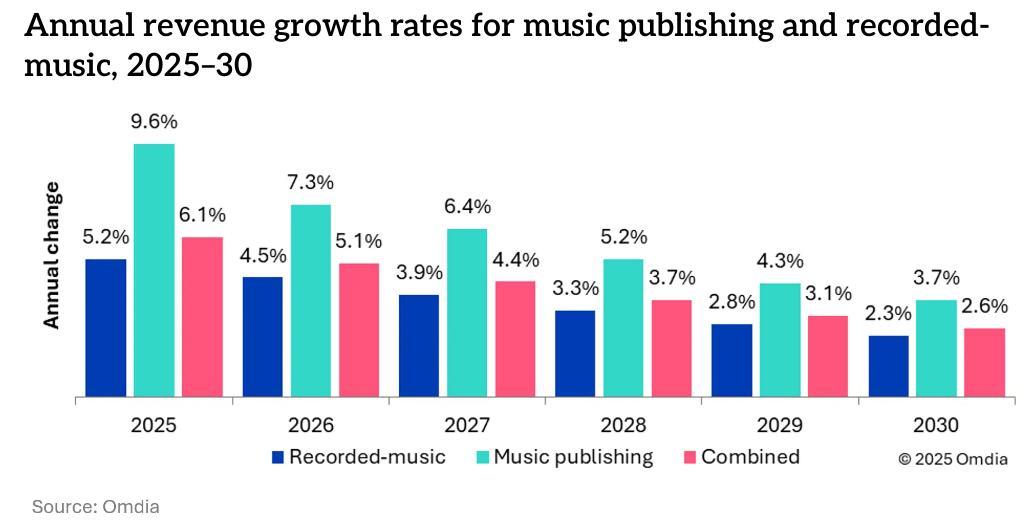 音乐出版与录制音乐年度收入增长率,2025–2030
