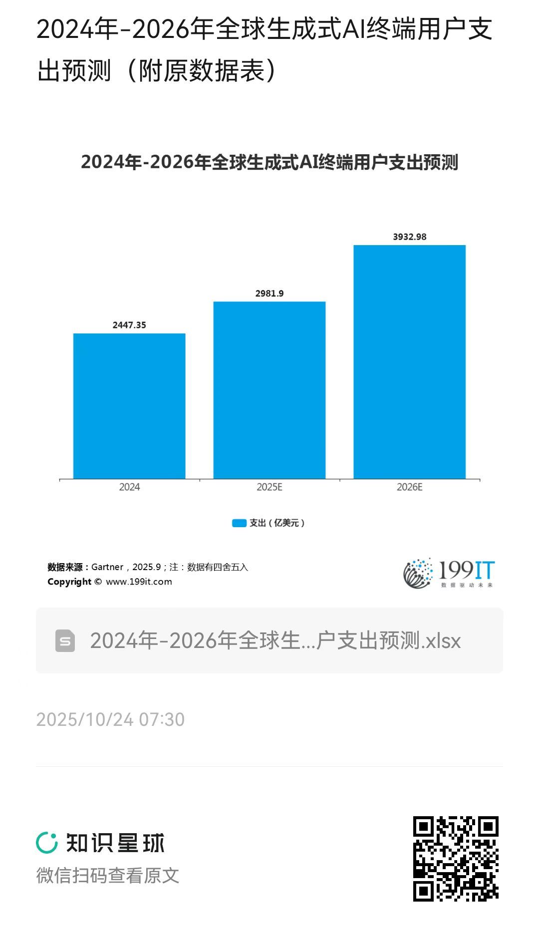 2024年-2026年全球生成式AI终端用户支出预测(附原数据表) ​​​